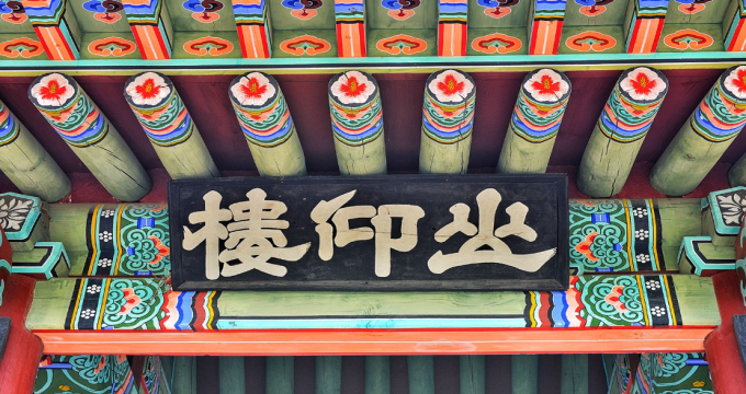 돈암서원 산앙루 현판, 첫 글자인 맨 오른쪽 산(山) 글자의 모양이 특이하다.