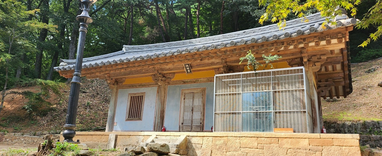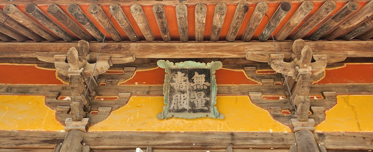 [無量壽殿懸板裏書] 粤在新羅儀鳳元年創建浮石寺金堂題字 恭愍王之親筆也當此庚午之時國族郞宣君到于浮石寺題于符板之意命其書鎭云到于辛未孟夏間寺晝僧瑛珌慨然傾心四雲角改造也