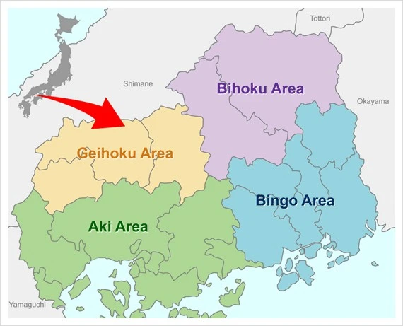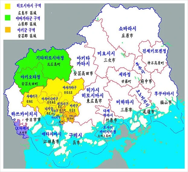이 두 개의 지역은 현재에도 문화와 방언의 차이가 존재하고 있다. 이렇게 역사적으로 아키와 빈고라는 두 개의 지역으로 나누고 있지만 히로시마현에는 좀 더 세부적으로 나눈 지방들이 있는데, 아래 지도를 보자.