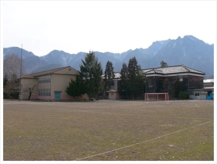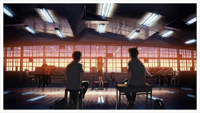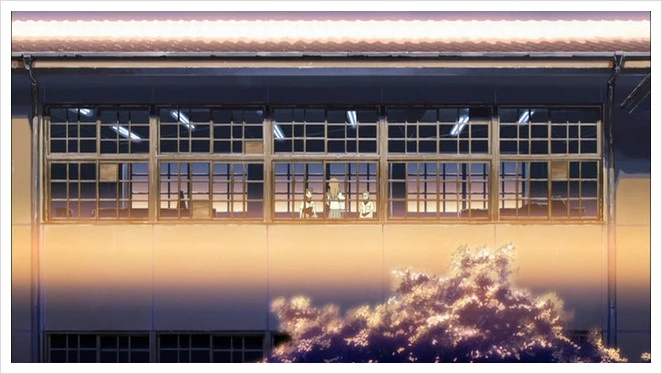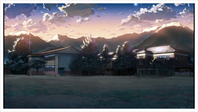 실제는 나가노현 우에다시의 니시오다니 소학교였다. 앞서 설명했던 대로 이 학교는 현재 폐교되었다. 애니상에서 표현되는 장면은 오후의 모습으로, 화면의 왼쪽에서 빛이 쏟아지고 있어 애니상의 카메라는 남쪽에서 찍고 있는 것처럼 보이지만 실제 이 카메라의 위치는 북쪽이다.
