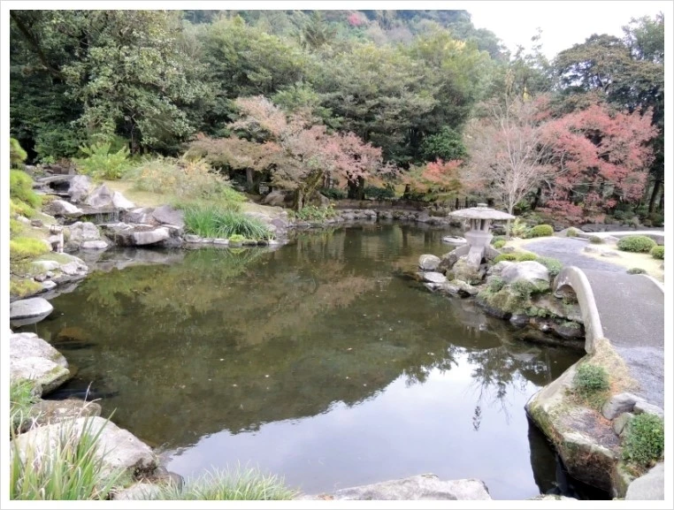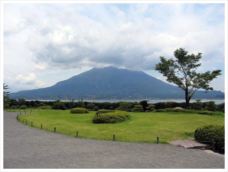저택 쪽에서 본 사쿠라지마의 풍경이다. 이 센간엔의 자리는 사쿠라지마를 보기에 가장 적당한 위치이다. 그도 그럴 것이 웅대한 사쿠라지마와 긴코만을 각각 쓰키야마(築山, 연못에 있는 작은 섬)와 연못으로 사용한 것이고 그런 장대한 스케일의 차경(借景)이 아름다워, 천하의 명원(名園)이라 한 것이다.