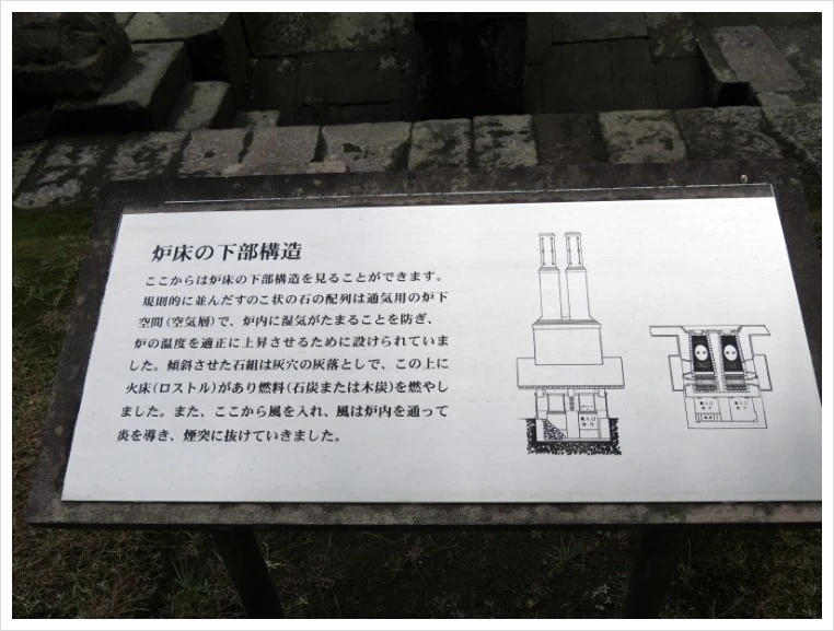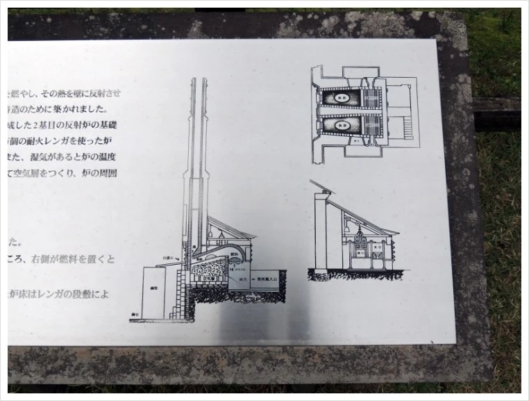 예전에는 이 기초 위에 약 20M 높이의 화로가 서 있었다고 한다. 사쓰마번 사람들은 네덜란드인들이 쓴 책을 기초로 해서 자신들의 기술을 더해 1857년에 이 반사로 건물을 완성시켰다. (이 시기에 조선은 어땠을까? 1857년은 조선의 철종이 통치하던 시기였고 세도 정치의 폐허로 국가의 기강이 무너져 내리던 시기였다.)