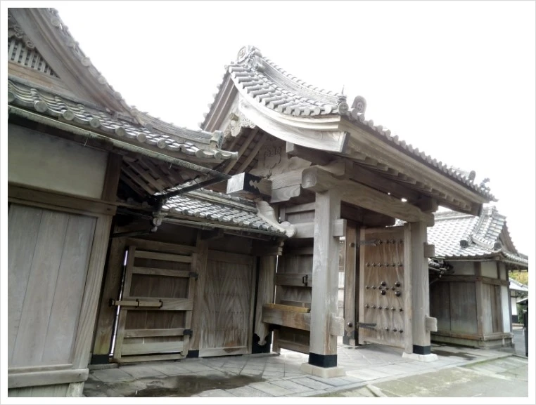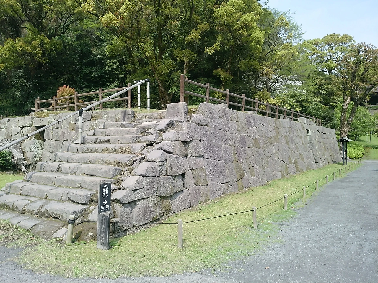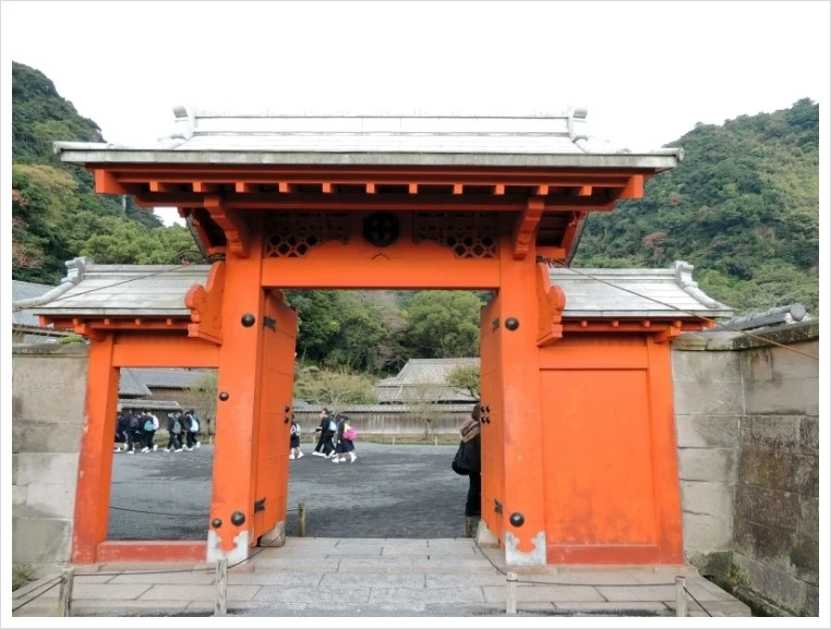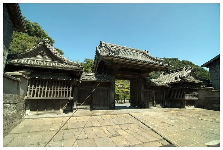 바깥쪽에서 본 정문이다. 이 정문 앞은 도로이고 그 옆이 바로 가고시마만이다. 이 정문을 지나면 왼쪽으로 ㄱ 자 모양으로 꺾어 들어가는데 거기에 다시 문이 있다. 그 문의 이름은 주석문.
