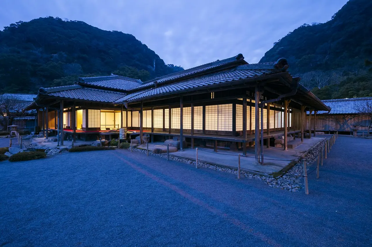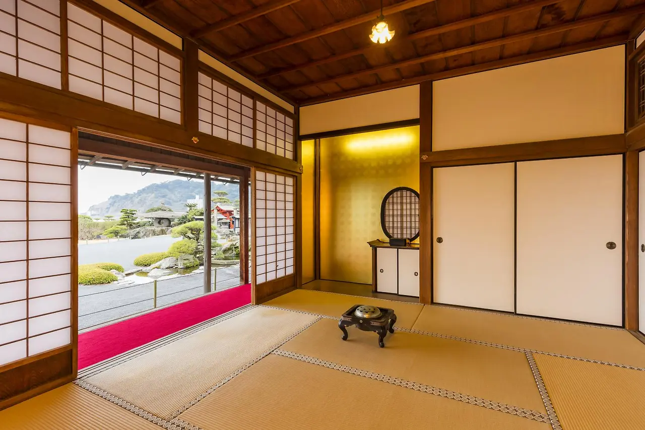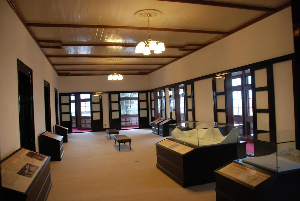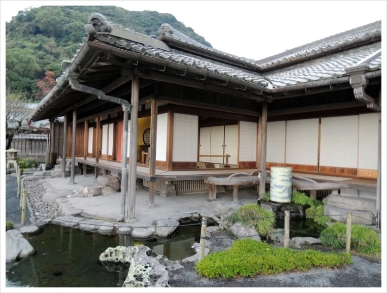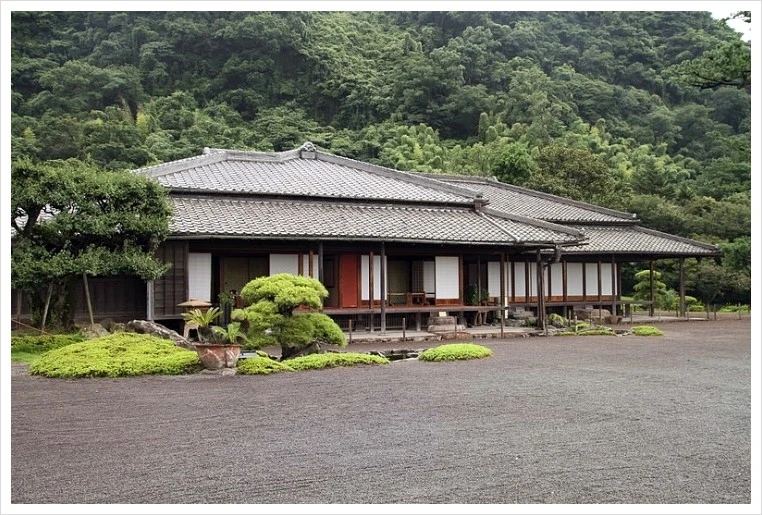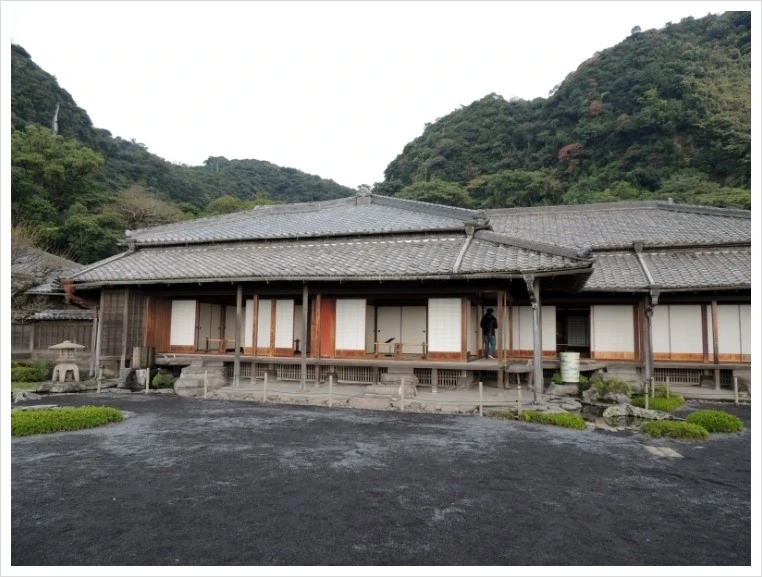 이 앞에 정원이 있고 이곳에서 바라보는 사쿠라지마의 풍경이 좋았다. 이곳은 원래 영주의 별장이었다. 그런데 폐번치현으로 가고시마성을 정부에 반환하게 된 이후 시마즈 가문의 가주와 가족들이 이곳으로 옮겨와 살았다. 현재 남아 있는 건물은 옛 건물의 1/3 정도이다.