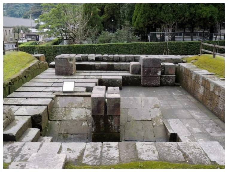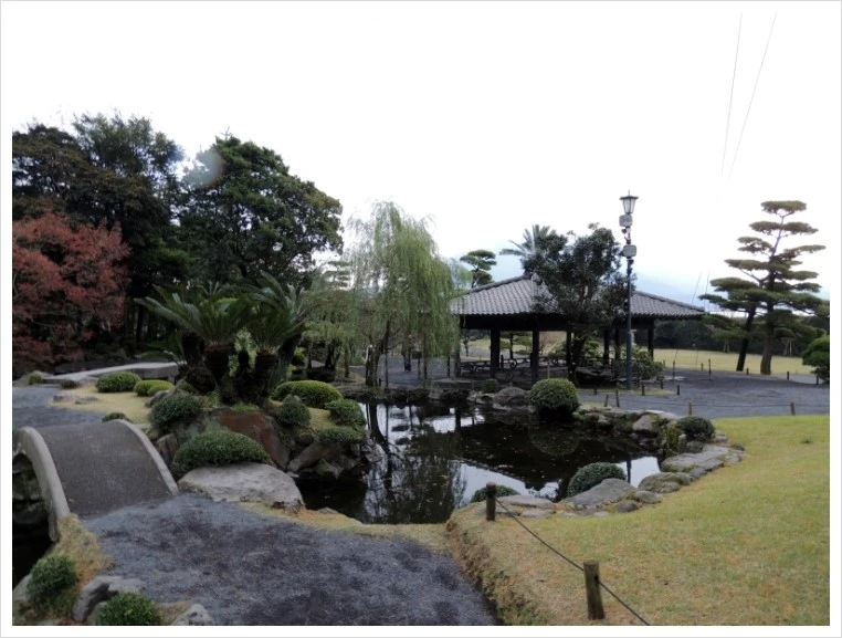 (사진의 오른쪽에 나와 있는 것이 정자望獄楼인데, 시마즈 가문의 마지막 번주인 시마즈 타다요시는 이 정자에서 사쿠라지마를 보았다고 한다. 니콜라이 2세가 일본을 방문했을 때에도 이곳에서 시마즈 타다요시와 면담을 했다고 한다. )