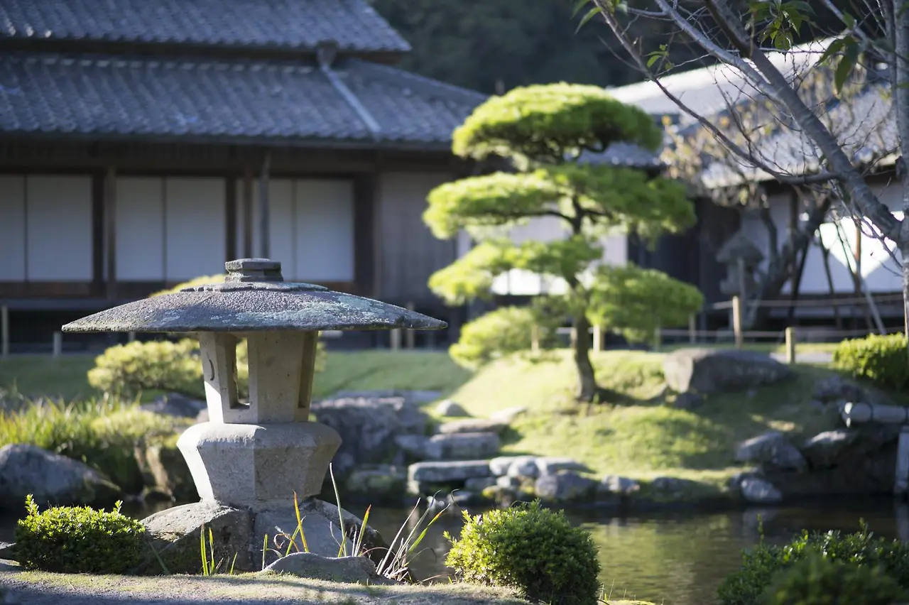 에도시대 말기에는 번주 시마즈 나리아카라가 이 부지의 일부를 이용하여 유럽식 제철소와 유리공장을 건설하는 등의 현대화사업(집성관 사업集成館事業)을 일으켰다. 1857년에는 원내의 석등롱에 가스관을 연결하여 점화시켜 등불로 사용하기도 했는데 이것이 일본의 가스등의 발상지로 꼽히고 있다. 주차장에 버스가 서면 안내원이 사람들을 이끌고 정문을 통해 원내로 입장하게 되는데 워낙 명승지다 보니 수학여행, 일반 여행자들이 뒤섞여 그야말로 인산인해를 이루었다. 정문으로 들어가기 전에 보이는 신사가 하나 있는데 바로 쓰루가네 신사鶴嶺神社이다.