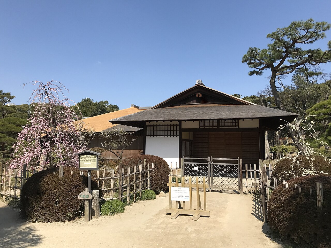 최초에 나리아키라의 명에 의해 정원을 만든 것은 아사노 나리아키라의 충실한 신하였던 우에다 시게야스(上田 重安1563-1650)에 의한 것이지만, 정원의 원형은 교토 정원사 시미즈 시치로에몬(淸水七郎右門)에 의해 대대적인 개수 작업에 의해 만들어졌다. 이후 여러 개수 작업등이 이어졌고, 1900년대초, 메이지 시대 말기 무렵에 현재의 모습이 되었다. 그러나 1945년 히로시마시에 원자폭탄 투하에 의해 황폐화되었고 전쟁이 끝난 이후 재건 작업은 1970년대까지 계속 되었다.