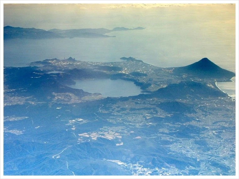사진의 오른쪽에 솟아 있는 봉우리가 가이몬다케이고 왼쪽원형으로 보이는 물이 이케다호수 그리고 가운데쯤에 돌출되어 있는 곳이 바로 나가사키바나라는 곶이다. 예부터 자연풍광이 아름답기로 유명했던 곳이다.