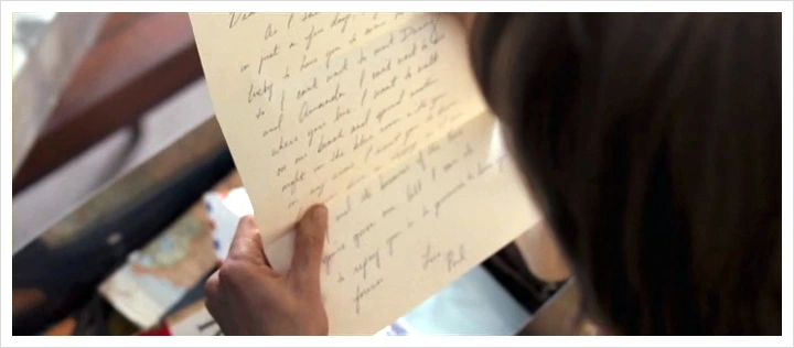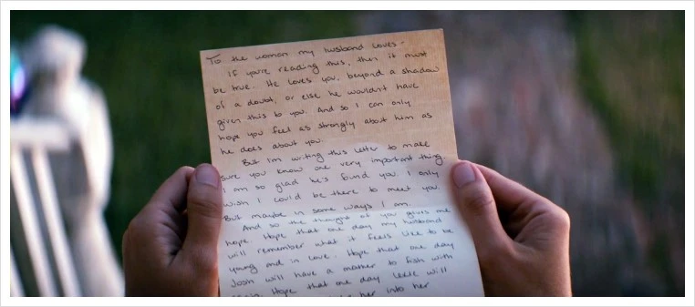 " 내 남편이 사랑하는 여인에게.. 이걸 읽는다는 것은 정말 그런가 보네요. 그가 당신을 사랑하는 거요. 정말 진심으로.. 그가 이 편지를 당신에게 줬겠네요. 내가 바라는 건 그가 당신을 생각하듯이 당신도 같은 마음이면 좋겠어요. 내가 이 편지를 남기는 이유는 정말 중요한 걸 알아줬으면 해서예요. 그가 당신을 찾은 게 너무 기뻐요. 그곳에 있었으면 하는 바람이고, 당신도 만나보고 싶고, 아마 다른 방식으로 그럴 거예요. 제 남편옆에서, 사랑스러운 두 아이의 옆에서.. 당신은 세상에서 가장 중요한 사람일 거예요, 왜냐하면 나는 떠나고 지금은 당신이 있으니까요. 웃게 만들어주세요. 울면 달래주고, 그들 곁에서 잘못된 건 올바르게 가르쳐 주세요. 당신을 생각하면 희망이 생겨요. 알렉스가 다시 사랑하는 감정을... 느낄 거라는 희망, 조시가 다시 누군가와 낚시를 한다는 희망, 렉시의 결혼식에, 누군가가 함께 할 거라는 희망, 언제가 다시 모두 한 가족이 되길 희망합니다.