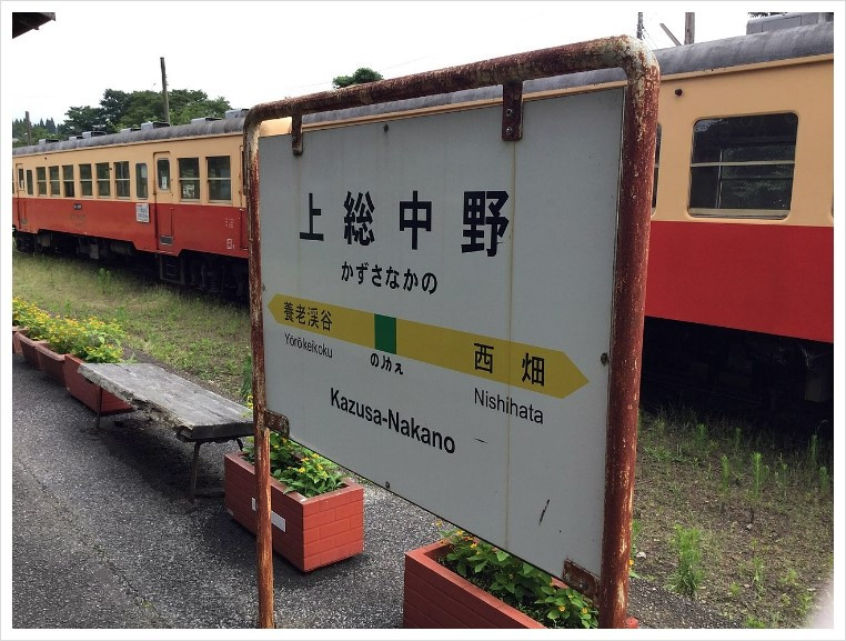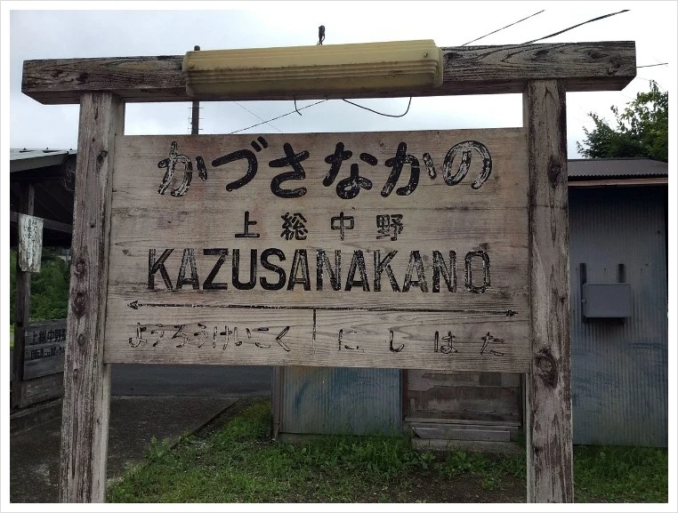카즈사나카노역은 고미나토선의 종점역이기도 하지만 이스미선 いすみ線의 역이기도 하다. 각각의 다른 철도 회사가 한 역을 사용하고 있지만 고미나토선의 열차에서 내려서 이스미철도의 열차로 환승하는 개념이다. 그래서 역명이 새겨진 간판 또한 각각이다. 위의 사진이 고미나토선의 역명 표지판이고 아래 사진이 이스미선 いすみ線의 역명 표지판이다.