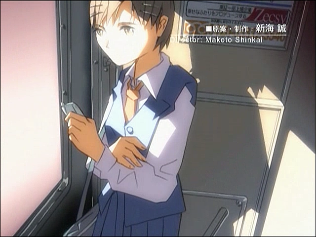 자, 첫 번째 미카코가 생각하는 세계는 휴대폰의 전파가 도달하는 곳이었다. 이 말에 해석을 하자면, 미카코의 세계는 휴대폰의 전파가 도달하는 곳까지, 그러니까, 사춘기 소녀가 생각할 수 있고 갈 수 있는 지점까지이다. 그런데 그녀는 국제 우주 연합군의 타르시안 탐사대에 선발되어, 휴대폰의 전파가 점점 닿지 않는 미지의 세계로 향하고, 마침내는 타르시안과 전투를 벌이게 된다. 뒷부분에 다시 설명하겠지만 우주로 떠난 이후, 가혹한 운명은 그녀를 , 우주 전쟁의 한 복판으로 밀어 넣고, 그 순간 그녀는 더 이상 순수한 소녀가 아니라 냉혹한 성인의 세계로 접어든다. 이것은 후속작인 구름의 저편, 약속의 장소에서 더 선명하게 드러난다.