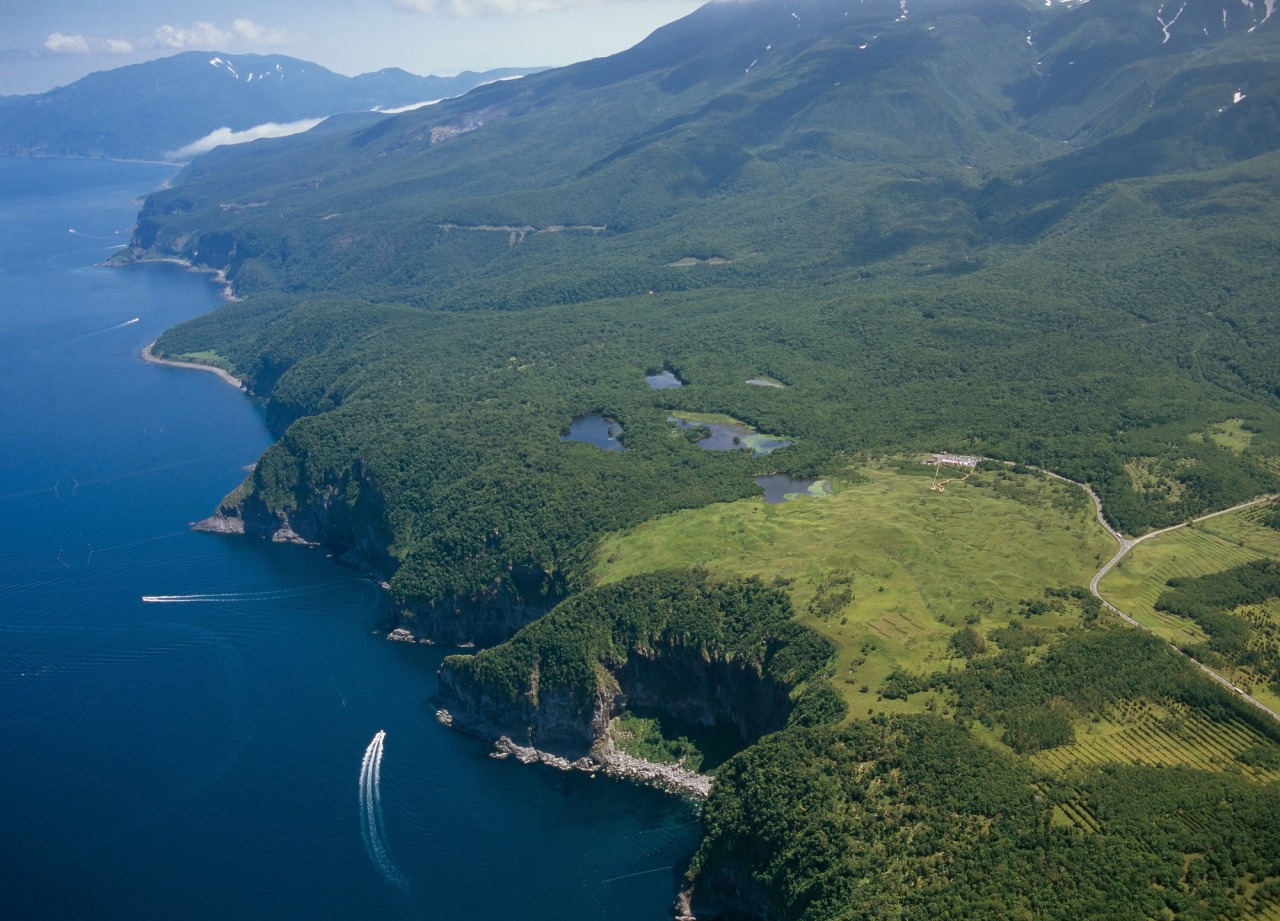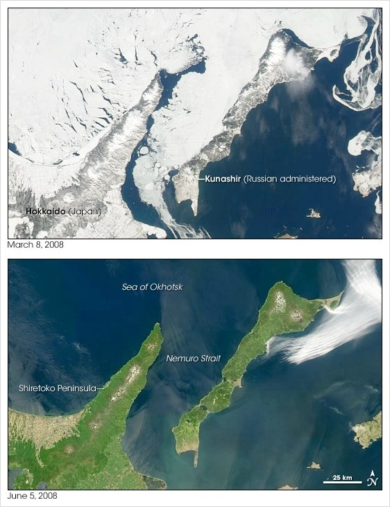 시레토코 반도의 오른쪽 편에 네무로 해협이 있고 그 오른편에 보이는 섬이 일본이 러시아와 영토 분쟁 중인 북방 4개 섬 중의 하나, 구나시리 섬이다. 사진 2장 중 위의 사진은 겨울철 유빙이 시레토코반도 앞바다까지 왔을 때의 모습이다.