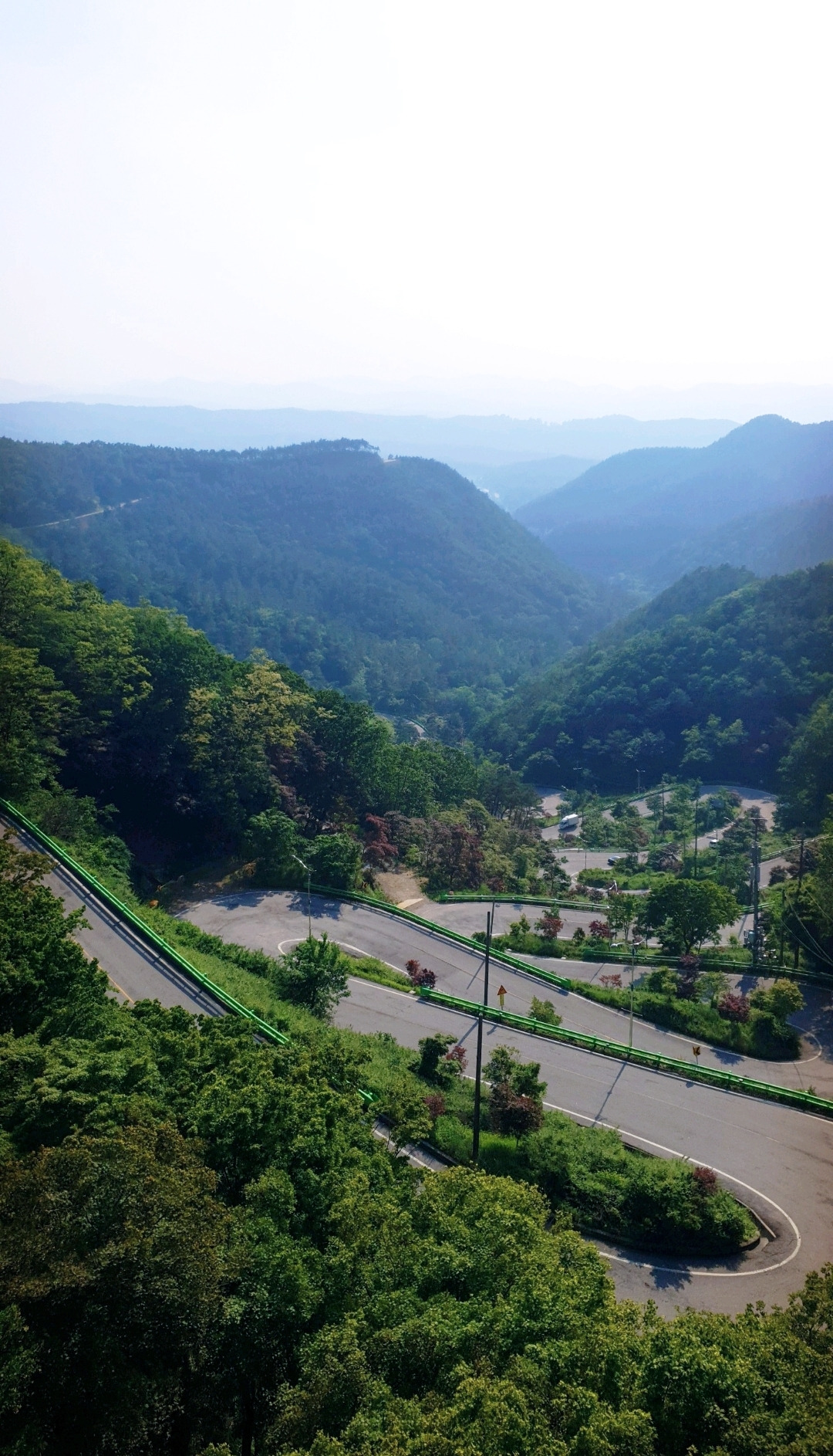 전망대로 올라가니 굽이굽이 둘러 내려가는 길 전체가 한눈에 들어왔다. 하늘과 맞닿은 산 능선마저 조화롭게 빛나고 있다.