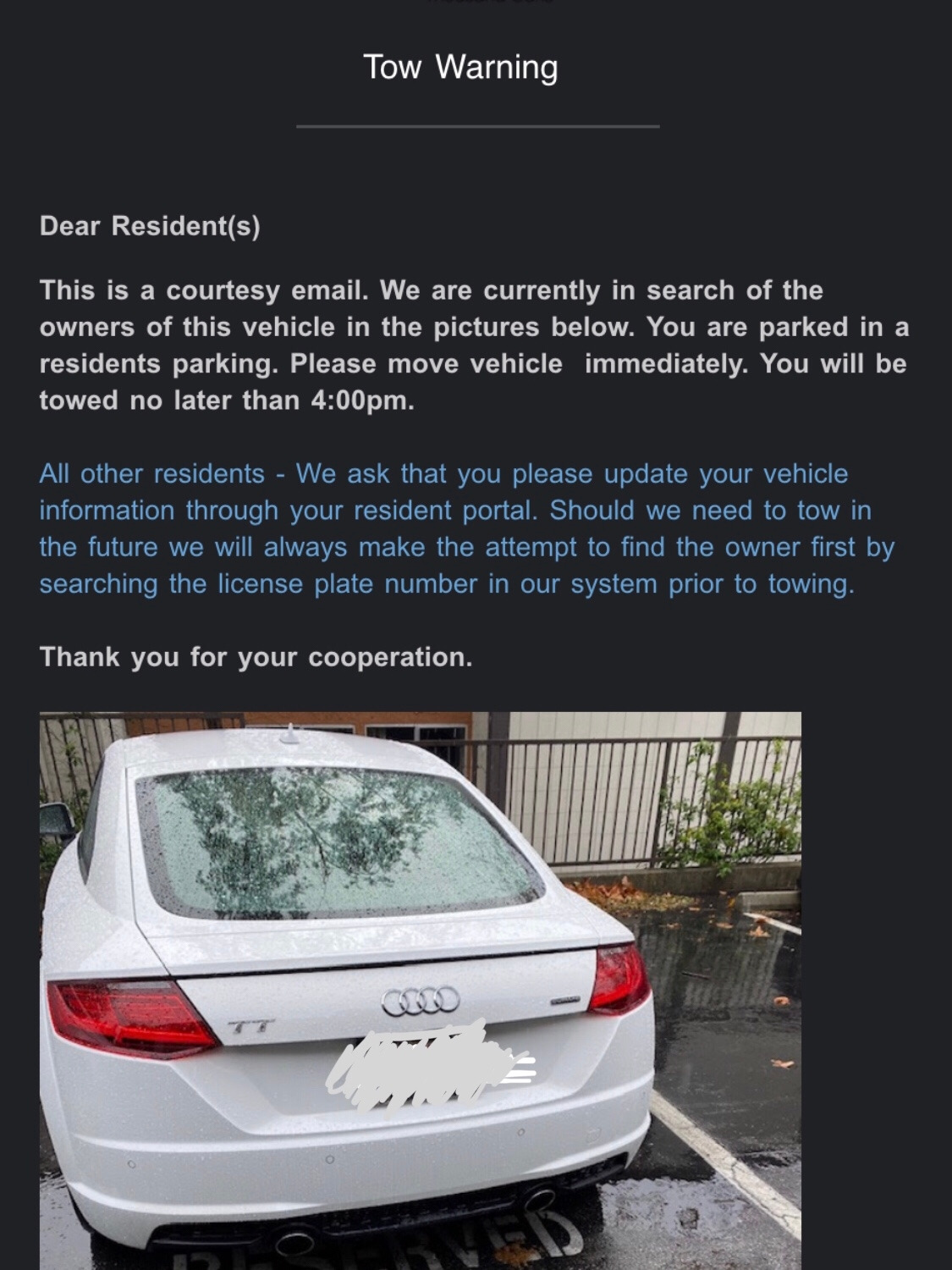 We are going to start the parking program. The reserved parking spaces will be opening up for reservations. There will not be any warnings given to those who park in spaces that are not assigned to their unit. Towing will be enforced at all times unauthorized vehicles will be towed at Vehicle Owners expense.