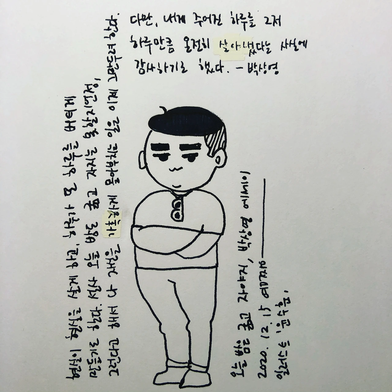 12월 초, 어느 늦은 밤이었다. 잠이 오지 않아 전자책 사이트를 배회하다가 장기하의 산문집 <상관없는 거 아닌가?>를 구매, 다운로드해서 읽기 시작했다. 그의 책을 읽고 있으니 더더욱 잠이 오지 않는다. 그의 글로부터 내 생각의 파편들이 스멀스멀 떠오른다. 나도 내 감정, 생각, 생활들을 기록하고 싶단 생각을 오래전부터 해왔는데 말이다, 생각만. 바로 실행해 보고자 새벽 6시가 가까워진 시간, 좋아하는 몰스킨 노트를 하나 꺼내 들었다. "매일, 하루에 한 장 글쓰기", 오늘을 시작으로 2021년은 본격 글쓰기의 해로 삼아보겠다며 포부를 밝혀본다.(타향살이에서 생긴 병 중 하나, 사소함에 관계없이 혼자 포부를 밝히고 혼자 꼼지락거리며 하는 일들이 많다) 내 생각의 파편들이 쌓이고 쌓이다 보면 뭐라도 남아 있지 않을까 싶어서... 그렇게 시작되었다. 매일 쓰기로 했으니깐, 매일 글쓰기장을 펼쳤다. 그러나 매일 쓰기로 했다고, 글감이 자동으로 생기지는 않는 법. 신변잡기적인 하루 일과, 마음에서 올라오는 짜증, 일상에서 벌어지는 사건에 대한 궁금증 같은 것을 떠오르는 대로 무. 작. 정. 채워 넣기 시작했다. 오늘은 뭘 쓰지? 내 하루에 물음표가 하나 더 생겼다.