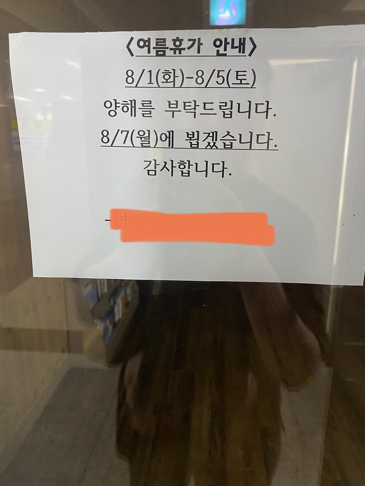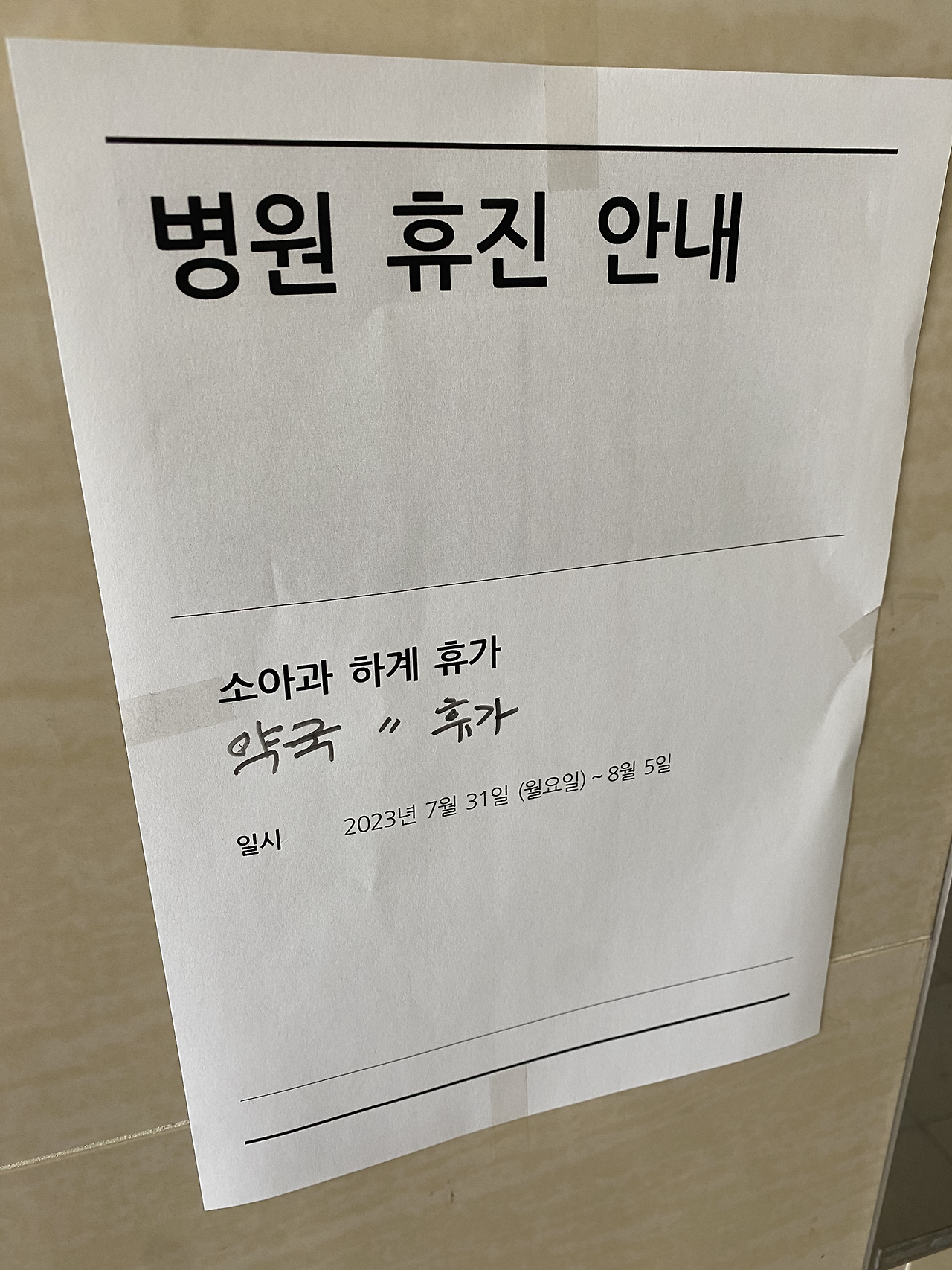 8월 초. 집 앞 소아과는 여름휴가로 인해 휴진이었다. 아 맞다. 저번주에 공지 봤었지.. 지하철로 한 정거장 떨어진 소아과로 갔다. 폭염이라 아기가 더울 것 같아 지하철을 타고 이동했다. 포털에서 검색을 했을 땐 '영업 중'이라고 쓰여있었는데 막상 가니 휴가 안내 딱지가 붙어있다. 이럴 수가. 택시를 타고 또 한 정거장 떨어진 소아과로 향했다. 이번엔 전화를 먼저 해보고 휴가가 아니라는 것을 확인했다.