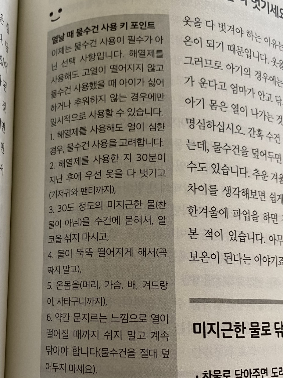 기존에 내가 가지고 있었던 2007년 판 책에서는 '열날 때 물수건 사용 키 포인트'라는 챕터가 있었고 해열제를 사용해도 열이 떨어지지 않는 경우 물수건을 사용하라고 돼있었다. 옷을 다 벗기고 물이 뚝뚝 떨어지게 해서 온몸을 '쉬지 말고' 닦으라는 것이었다. 우리 아기의 경우 열이 39도 이상은 아니었지만 거의 비슷하게 임박하고 있었고 해열제를 먹이고 열이 떨어질 때까지는 물수건을 사용해야겠다고 생각했다. 물론 이 책에도 '열을 떨어뜨리는 데는 해열제 사용이 가장 중요하며, 물로 닦아주는 것은 꼭 필요한 경우에만 하십시오'라고 쓰여있긴 했다. 아마 해열제를 먹이지 않고 물수건으로만 열을 내리려는 부모도 있을 것이기에 이런 문구를 사용한 것 같았다.
