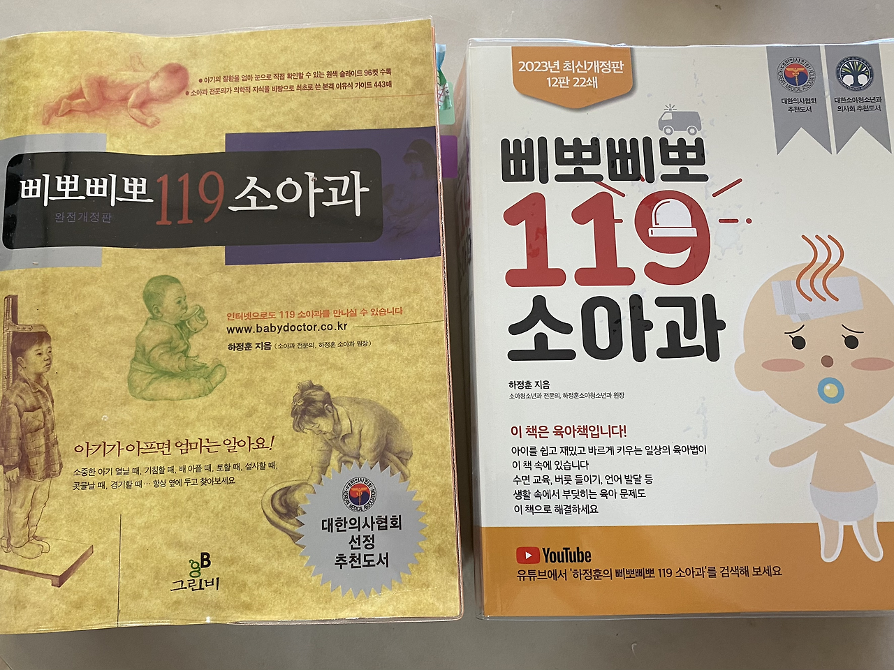 다행히 아기는 해열제를 먹이니 금방 열이 떨어졌고 잠에 들었다. 그래도 밤에 또 열이 날 수 있으니 밤에도 갈 수 있는 병원 리스트를 찾아놨다. 그제야 불안한 마음이 조금 사그라들었다. 찬찬히 TV장 한편을 떡하니 차지하고 있는 육아 바이블 '삐뽀삐뽀 119 소아과'에서 '열이 날 때' 챕터를 찾아보았다. 사실 이 바이블은 당근마켓에서 거의 택배비만 주고받은 것으로, 판형만 보아도 아주 예전 버전의 책인 것을 알 수 있는 책이었다. 책을 살 때는 '같은 사람이 쓴 육아서인데 뭐가 그렇게 다르겠어?'라고 생각하면서 이전 버전으로도 충분할 것이라 생각했다.