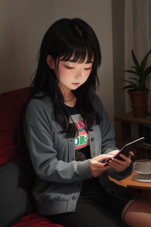 "핸드폰 스크롤을 내리는 사람 회색옷을 입은 걸로 그려줘"