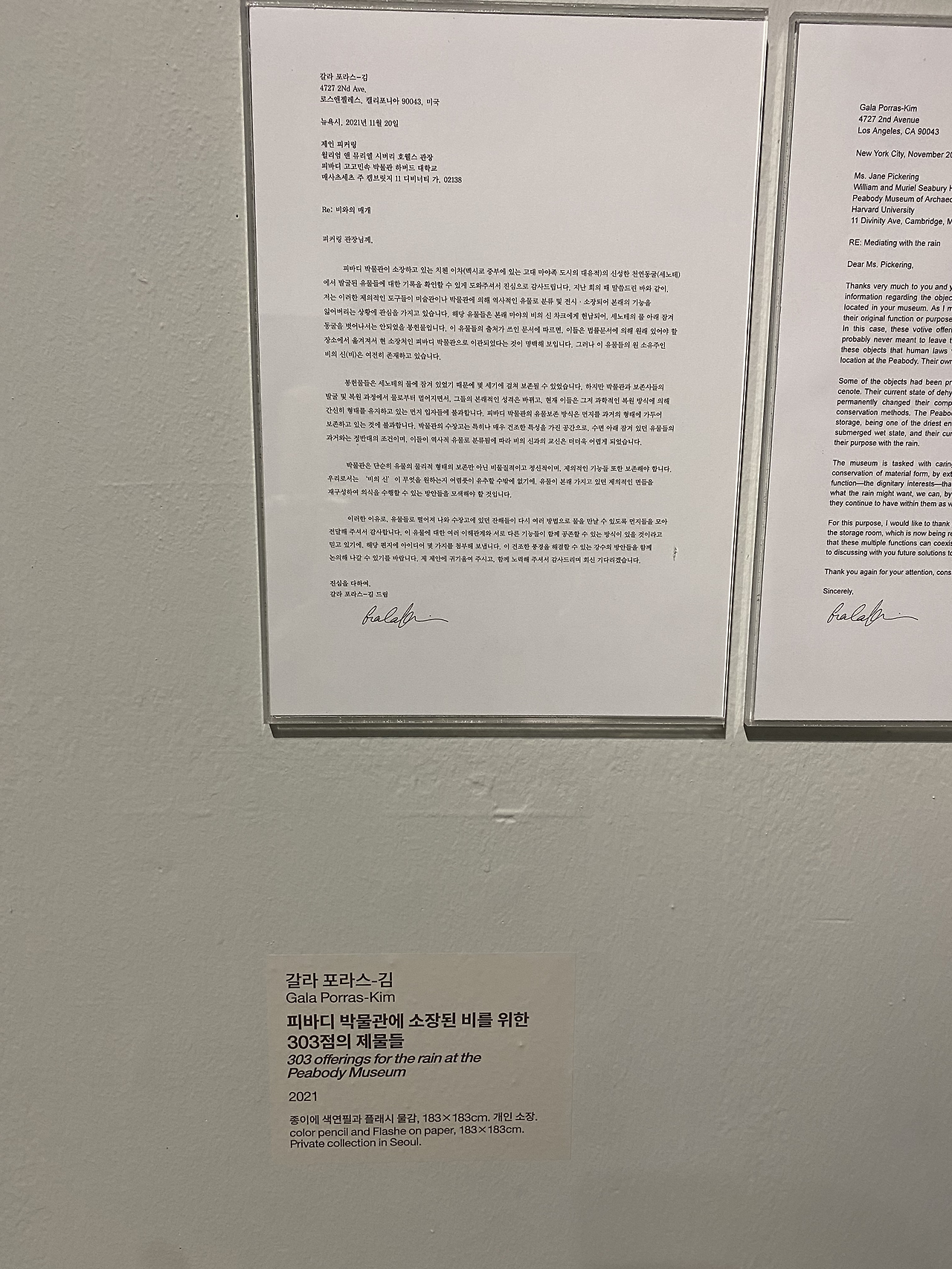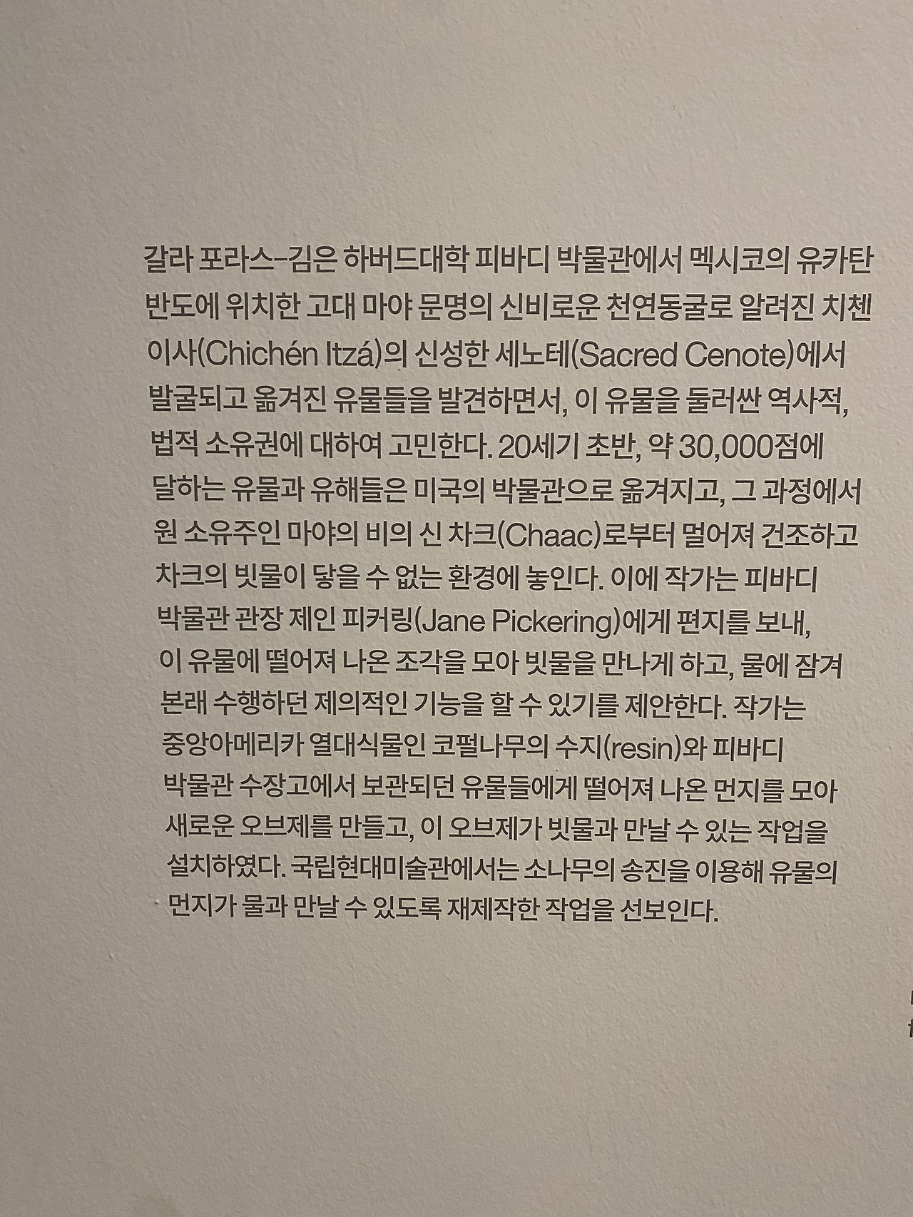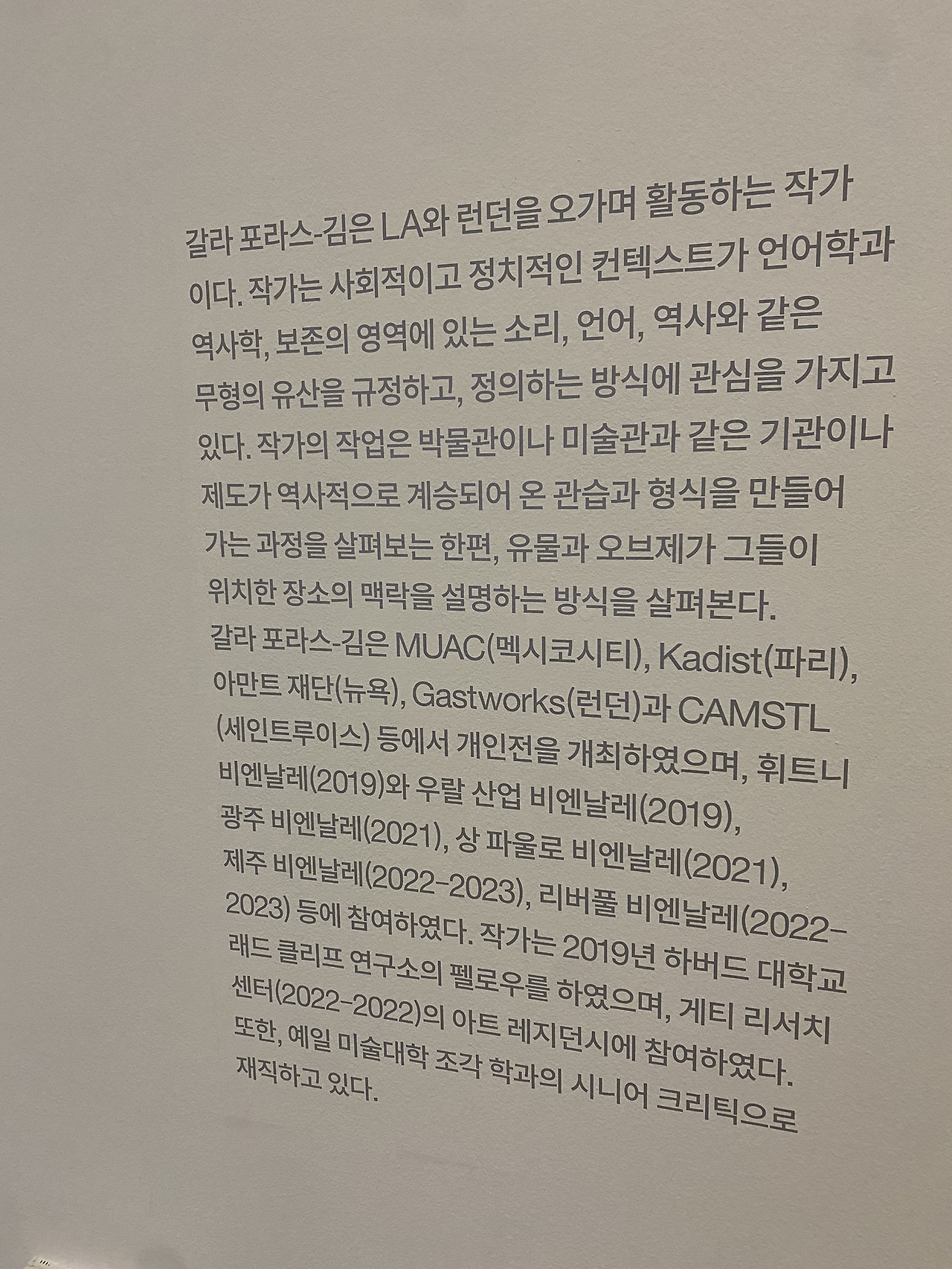 작가의 이름에서부터 느껴지긴 하지만, 갈라포라스 김은 과거의 문명에 관심이 많은 작가다. 고대의 유적들이 박물관이나 미술관에 전시되는 상황에서, 그 보관 상황에 대해 의문을 던지기도 하고, 보관된 유물과 관련해 실제로 박물관에 연락을 해 여러 가지 제안을 하기도 한다. 이 전시를 보면서 그가 미술 작가이면서 액티비스트, 글쓰기 작가이기도 하다는 인상을 받았다.