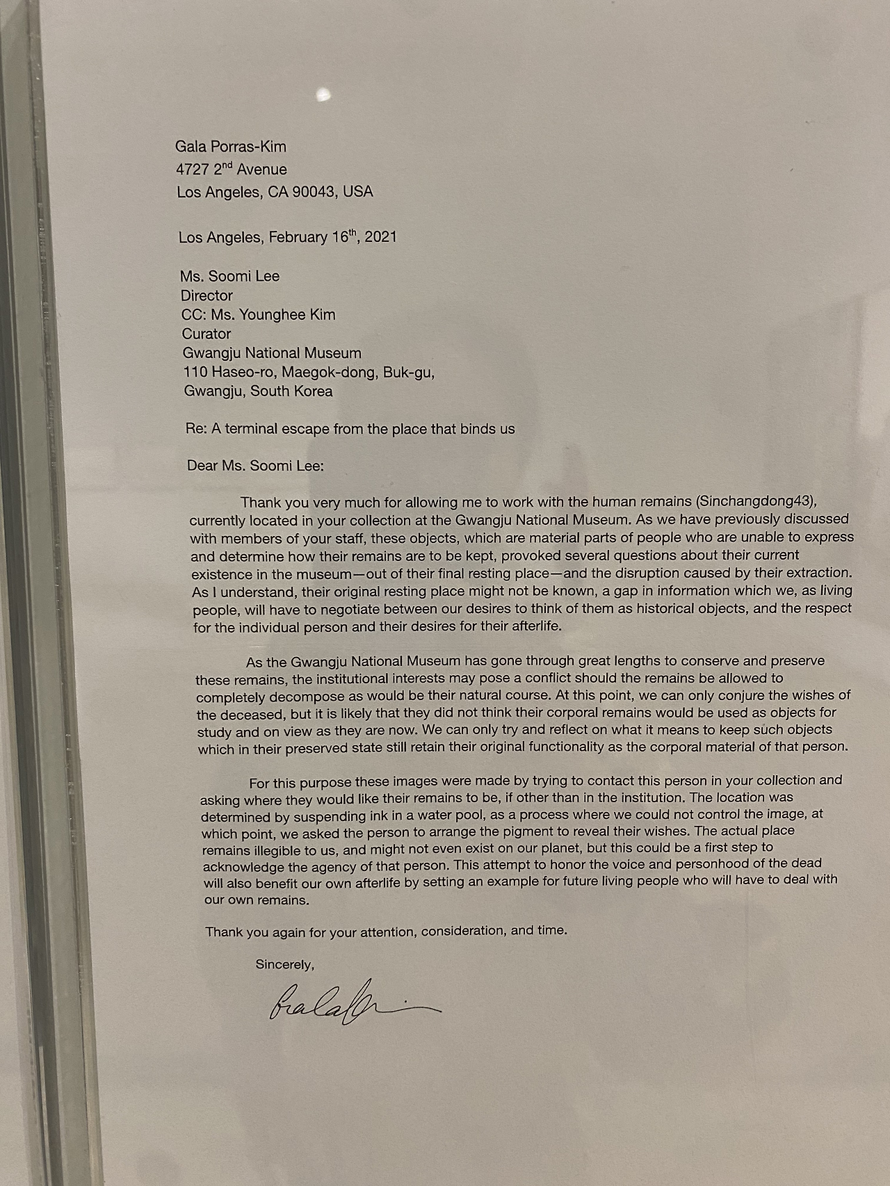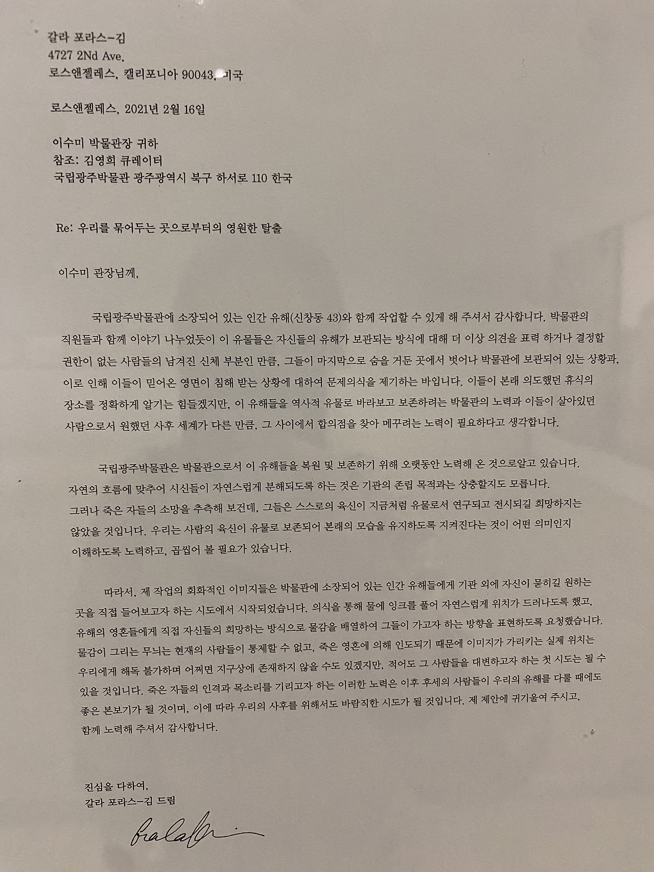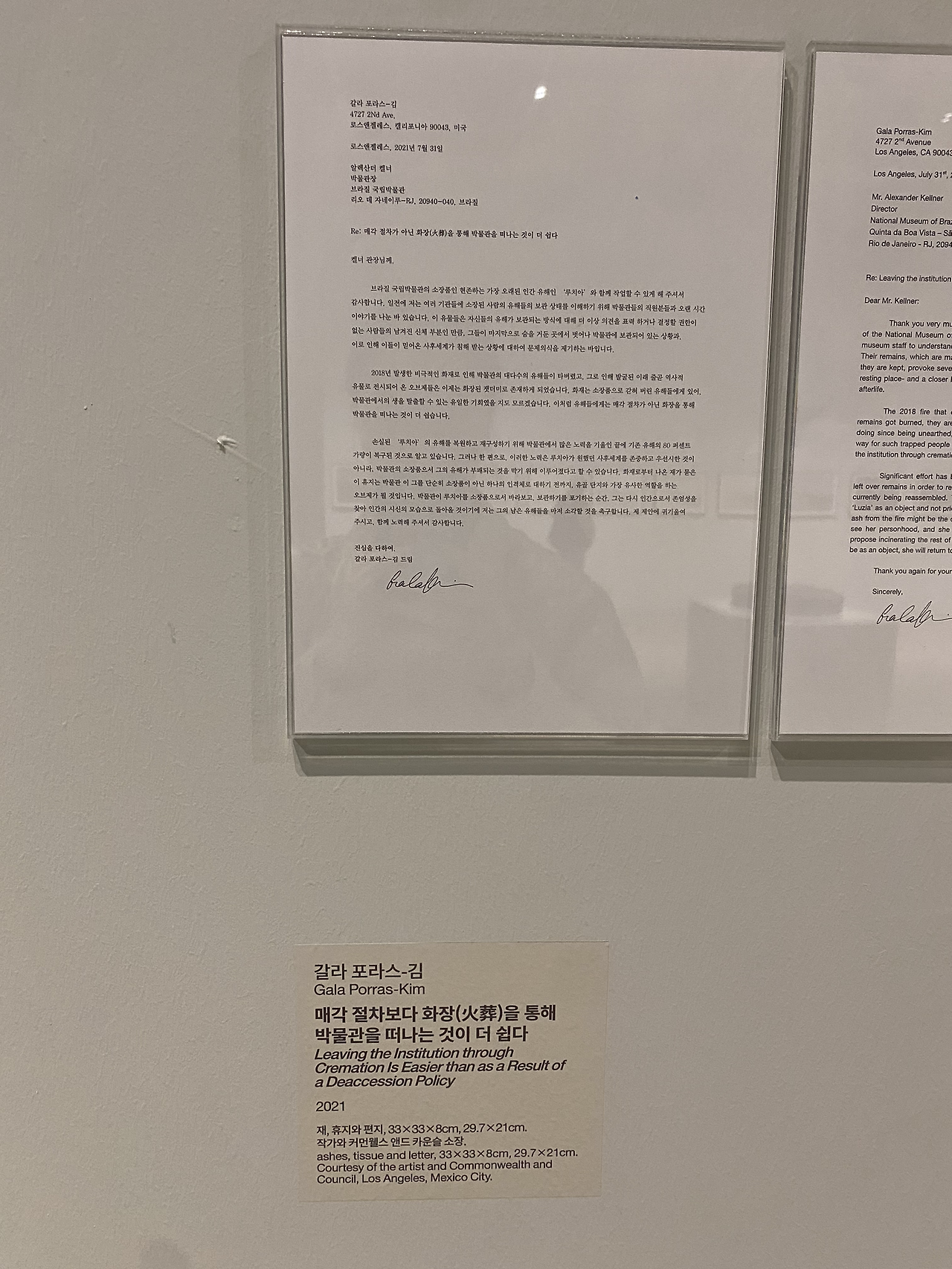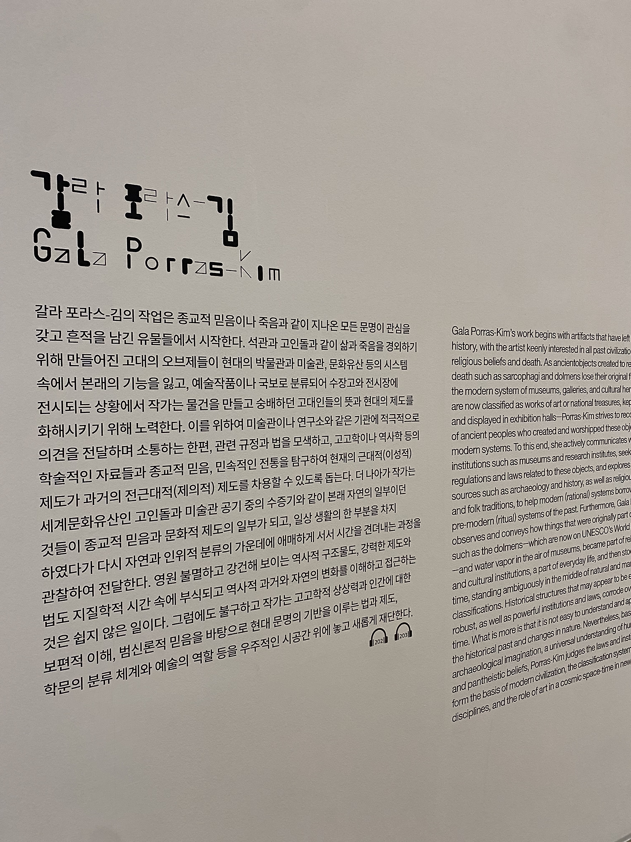 작가의 이름에서부터 느껴지긴 하지만, 갈라포라스 김은 과거의 문명에 관심이 많은 작가다. 고대의 유적들이 박물관이나 미술관에 전시되는 상황에서, 그 보관 상황에 대해 의문을 던지기도 하고, 보관된 유물과 관련해 실제로 박물관에 연락을 해 여러 가지 제안을 하기도 한다. 이 전시를 보면서 그가 미술 작가이면서 액티비스트, 글쓰기 작가이기도 하다는 인상을 받았다.