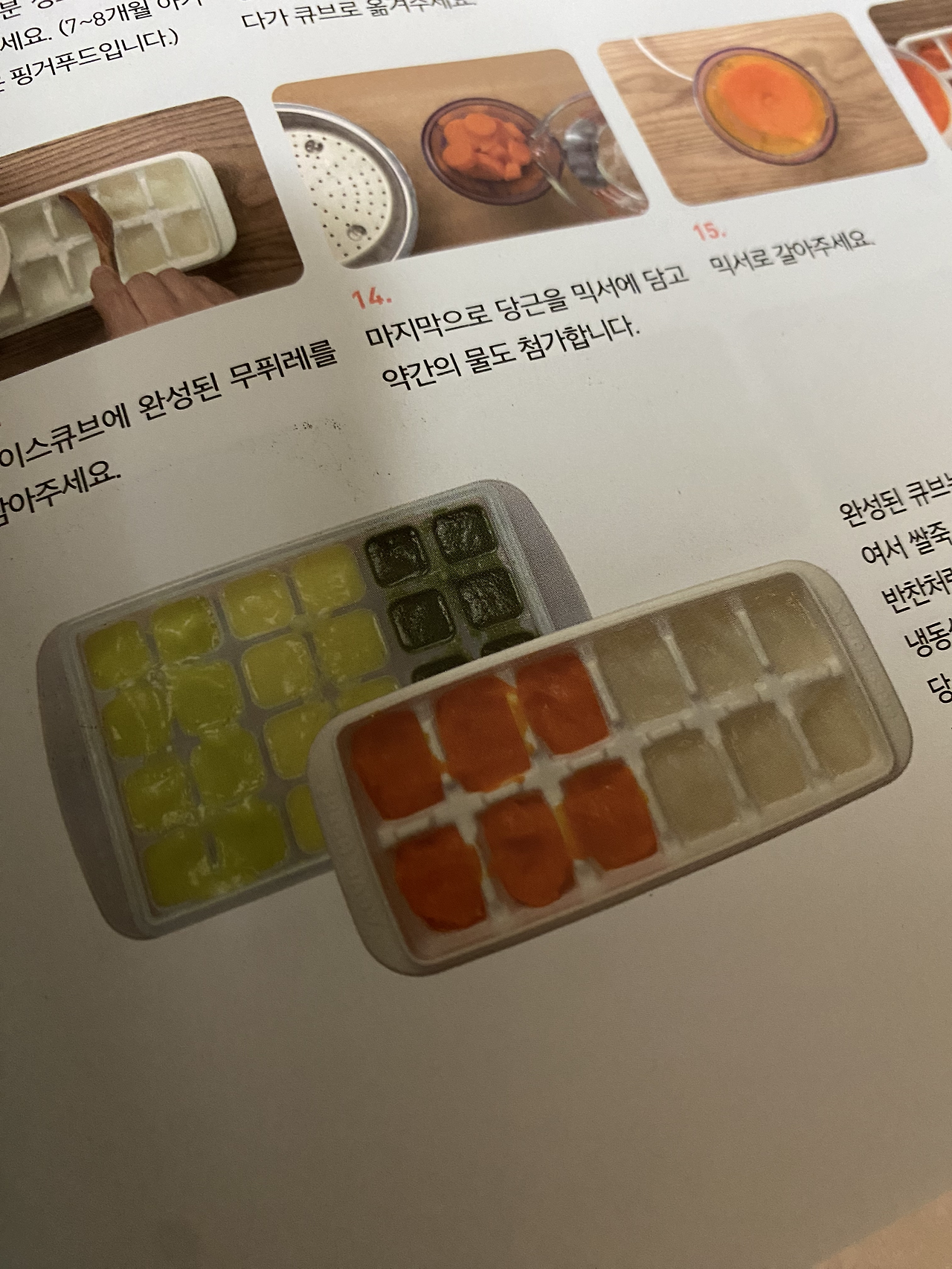 그렇다고 해서 매번 이유식을 새로 만들기는 무리였다. 내가 보는 이유식 책인 삐뽀삐뽀 119 이유식에는 야채 등을 한꺼번에 쪄서 큐브로 얼려 일주일 정도를 먹여도 된다고 나와있었다. 그렇게 만든 냉동 큐브들을 잘 조합해서 일주일 정도를 해동해서 먹이라는 것이었다. 인스타그램 등에서도 본 적이 있는 방법이었다.
