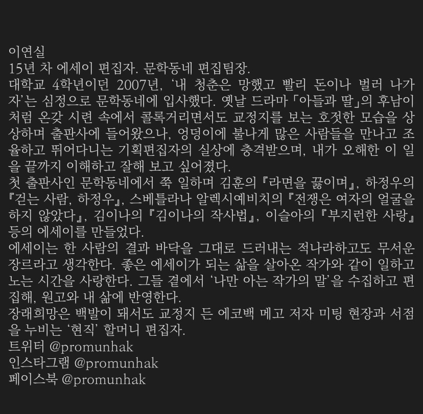 책을 읽으면서 유명한 책들을 편집한 이야기가 대단하기도 하고 재미있기도 했지만, 한편으로는 이 유명한 사람들과의 작업기를 읽으면서 ‘역시 에세이는 이미 유명한 사람이 써야 하는 건가..’라는 생각도 들었다.