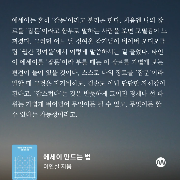 그러던 어느 날 정여울 작가님이 네이버 오디오클립 ‘월간 정여울’에서 이렇게 말씀하시는 걸 들었다. 타인이 에세이를 ‘잡문’이라 부를 때는 이 장르를 가볍게 보는 편견이 들어 있을 것이나, 스스로 나의 장르를 ‘잡문’이라 말할 때 그것은 자기 비하도, 겸손도 아닌 단단한 자신감이 된다고.