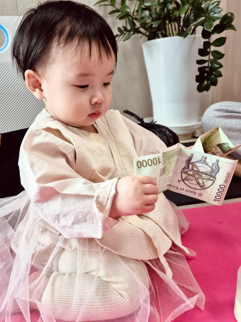 한복 드레스(?)를 입고 세뱃돈 받은 아기.