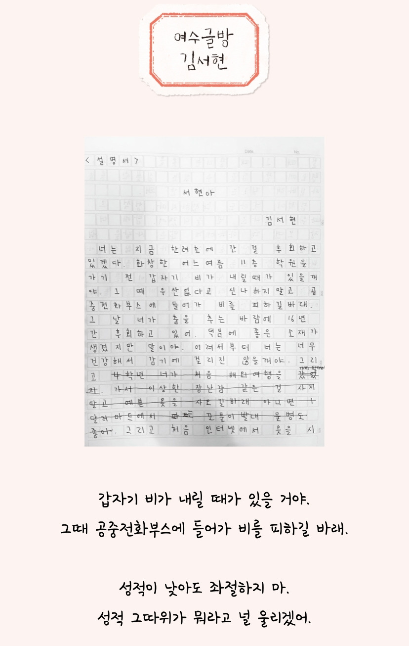 책 중반부에 삽입된 '여수 글방'의 아이들 한 명 한 명에게 쓴 편지들도 감동적이다. 이 편지는 내가 만난 좋은 어른들을 떠올리게 한다.
