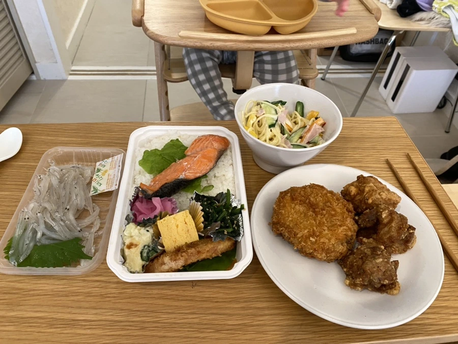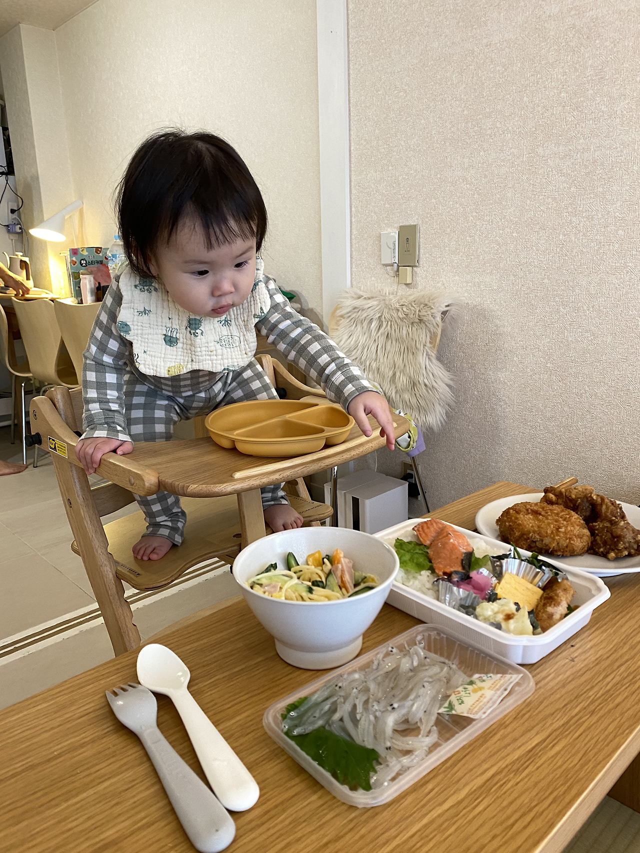 첫날은 이동에 힘을 많이 써서 따로 식당에 가진 않았고 집 앞 슈퍼마켓에서 작은 회와 연어 도시락, 치킨 가라아게와 멘치가스, 마요네즈 파스타 등을 사서 먹었다. 아기는 도시락에 있는 밥과 연어 구이, 계란말이 먹었다.