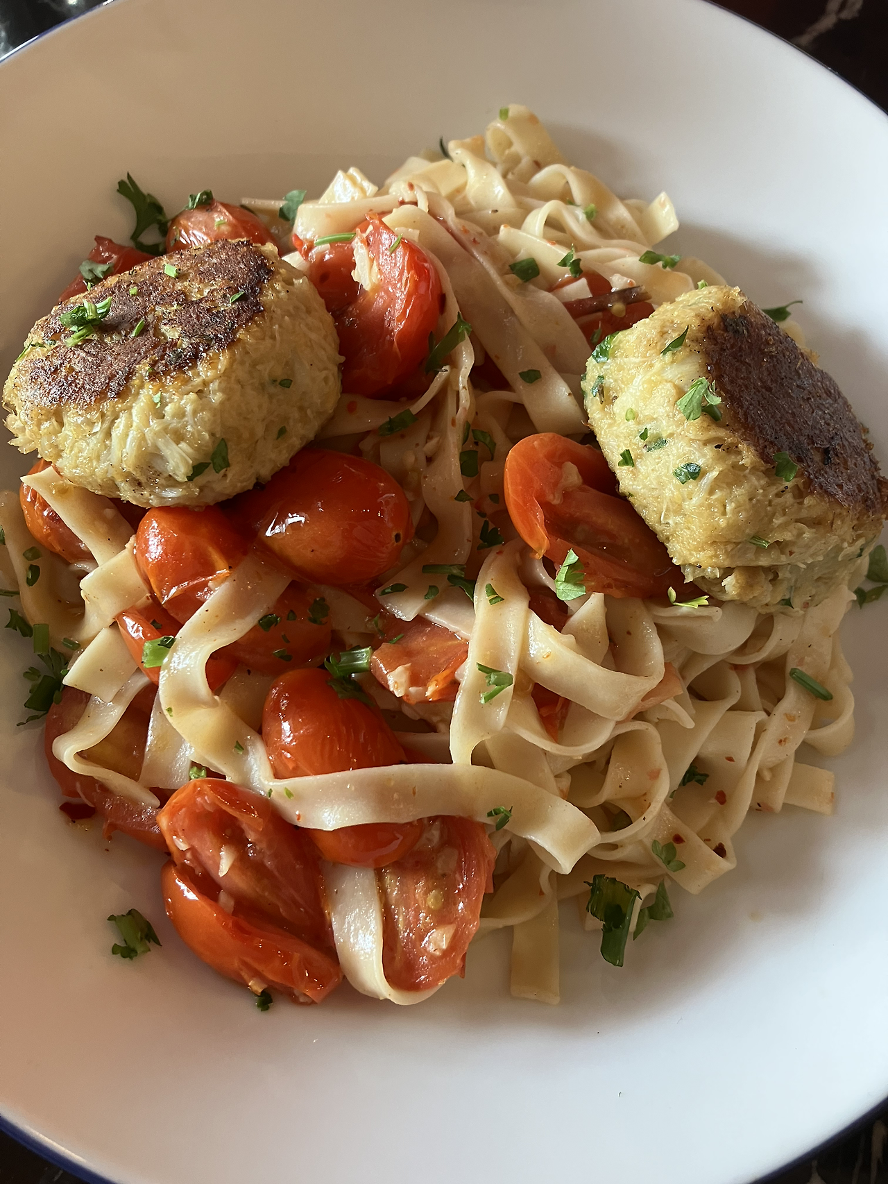 오기 전 근처 빵 맛집에서 산 에클레어를 먹을까 말까 상자를 만지작댈 때쯤 음식이 나왔다. 홈메이드 크랩케이크, 페투치네면, 체리 토마토, 칠리 플레이크, 허브, 레몬 브라운 버터 소스의 크랩 케이크 파스타. 입사 초 시애틀에서 처음 먹고 좋아하게 된 크랩 케이크를 반갑게 집어 들었다. 입에 넣으려다 크랩 케이크를 닮은 엄마 동그랑땡 생각이 난다.