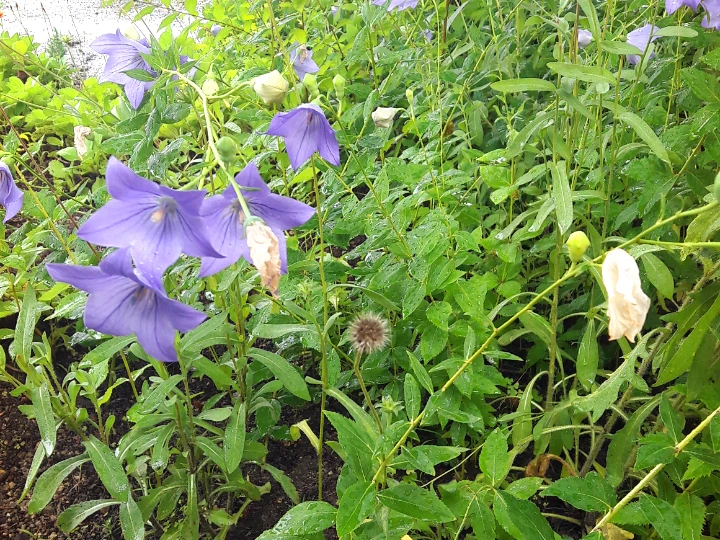 학교 화단에 있던 식물. 줄기 하나에 꽃봉오리, 꽃, 시든 꽃, 열매가 다 같이 열려있다.