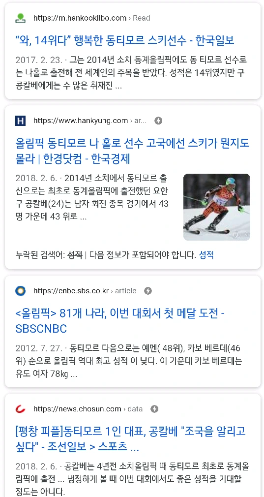 '동티모르 올림픽 성적' 검색 결과 1페이지. 동티모르는 우리니라 언론에서 줄곧 참가에 의의를 두는 나라로 보도되었다.