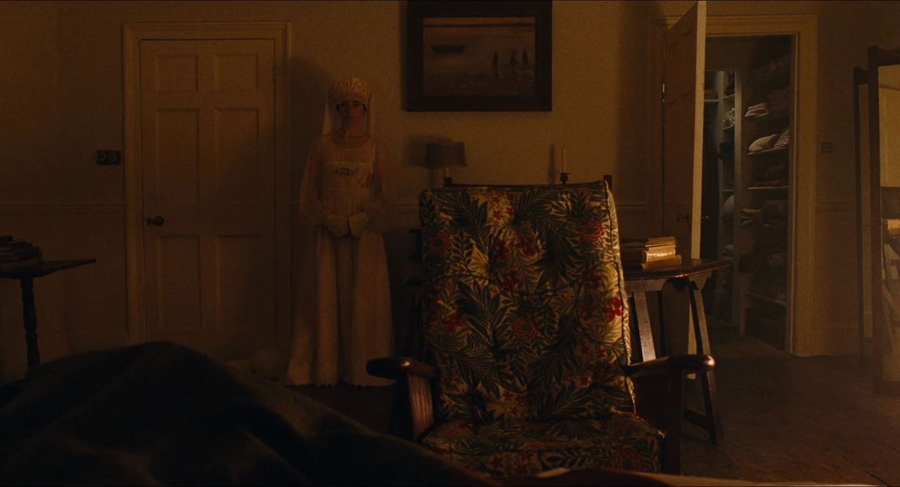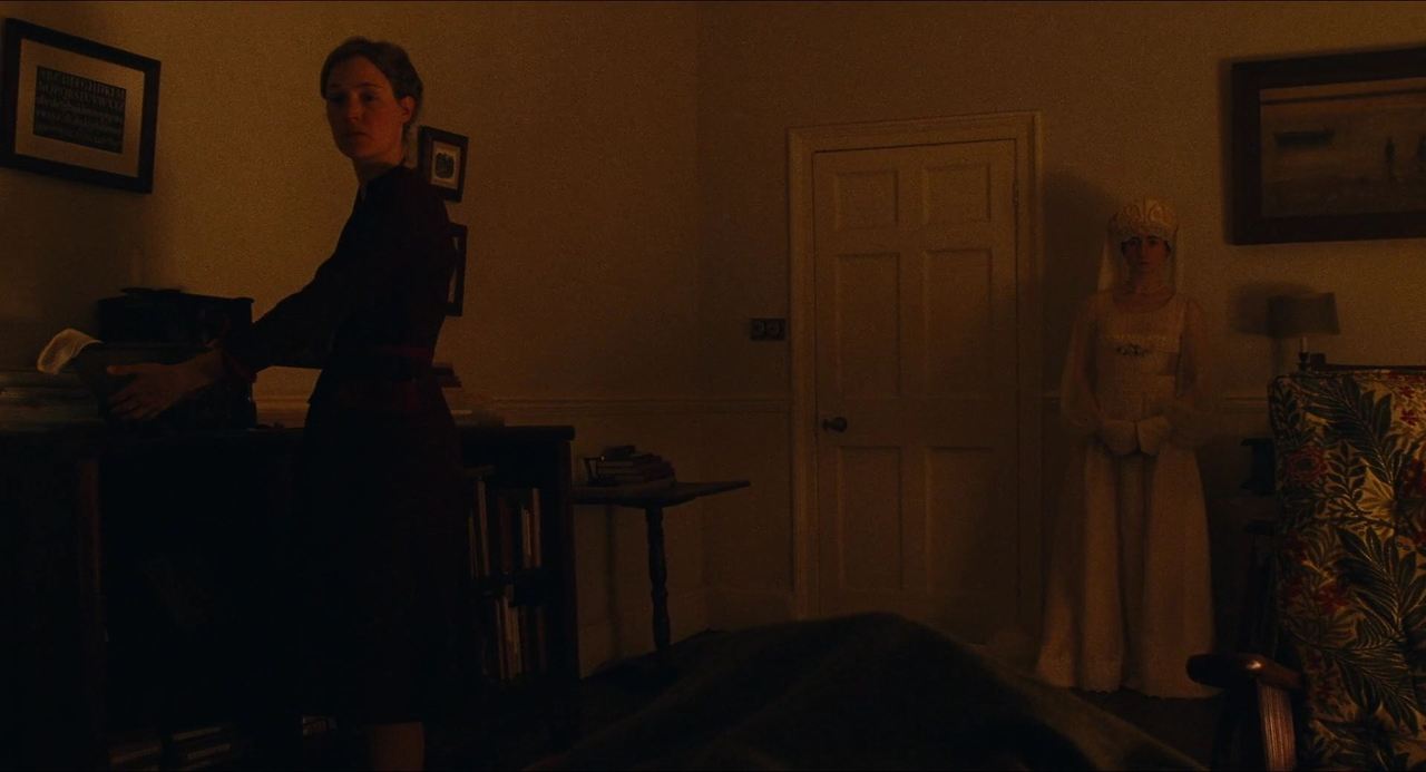 결국 알마가 치사량 보다 덜 우린 독버섯차를 마시고 레이놀즈는 앓아눕게 된다. 사경을 헤매던 그가 어머니의 환상을 보는 그 방으로 알마가 문을 열고 들어오는 장면은 내내 따라다닌 질문에 대한 이 영화의 답일 것이다. 아들과 어머니가 서로의 말을 알아들을 수 없는 '저세계'에서 유약해진 레이놀즈를 간호하려 돌아다니는 알마는 환상장면 내내 픽스됐던 카메라를 기어이 움직이게 하는 생명력을 갖고 있다. 어떤 대체나 양보 없이, 알마가 어머니의 환상과 공존하며 서있을 때 레이놀즈와 관객들 모두 깨닫게 된다. 산 사람은 산 사람이며 알마는 결코 그의 어머니가 될 수 없다는 것을. 어느덧 유령이 사라지고 소임을 다한 알마가 만족스러운 표정으로 다시 방을 나선다. 결코 죽음과 같던 이전의 삶으로 돌아갈 수 없어진 레이놀즈는 그 다음날 아침 그녀에게 청혼한다. 이전에 독버섯을 먹고 정신이 혼미해진 그가 비틀거리며 계단을 내려가는 모습은 자의든 타의든 문을 잠그고 고립되었던 2층의 작업실, 의상실에서 벗어나 알마의 세계로 진입하려는 전조로도 보여진다.