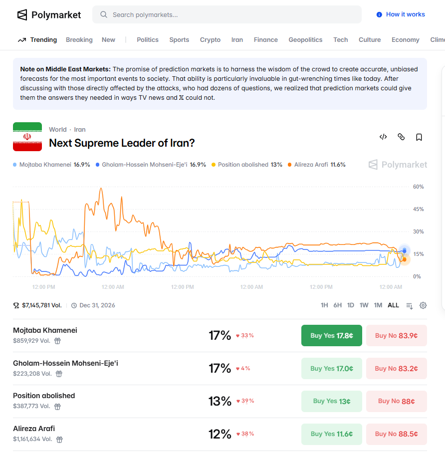 위에 적은 내용을 보면 현재 폴리마켓과 칼시(크립토 베팅 사이트)에서는 어떤 지도자가 이란의 차기 최고 지도자로 선정할 것인지 예측하고 있습니다.