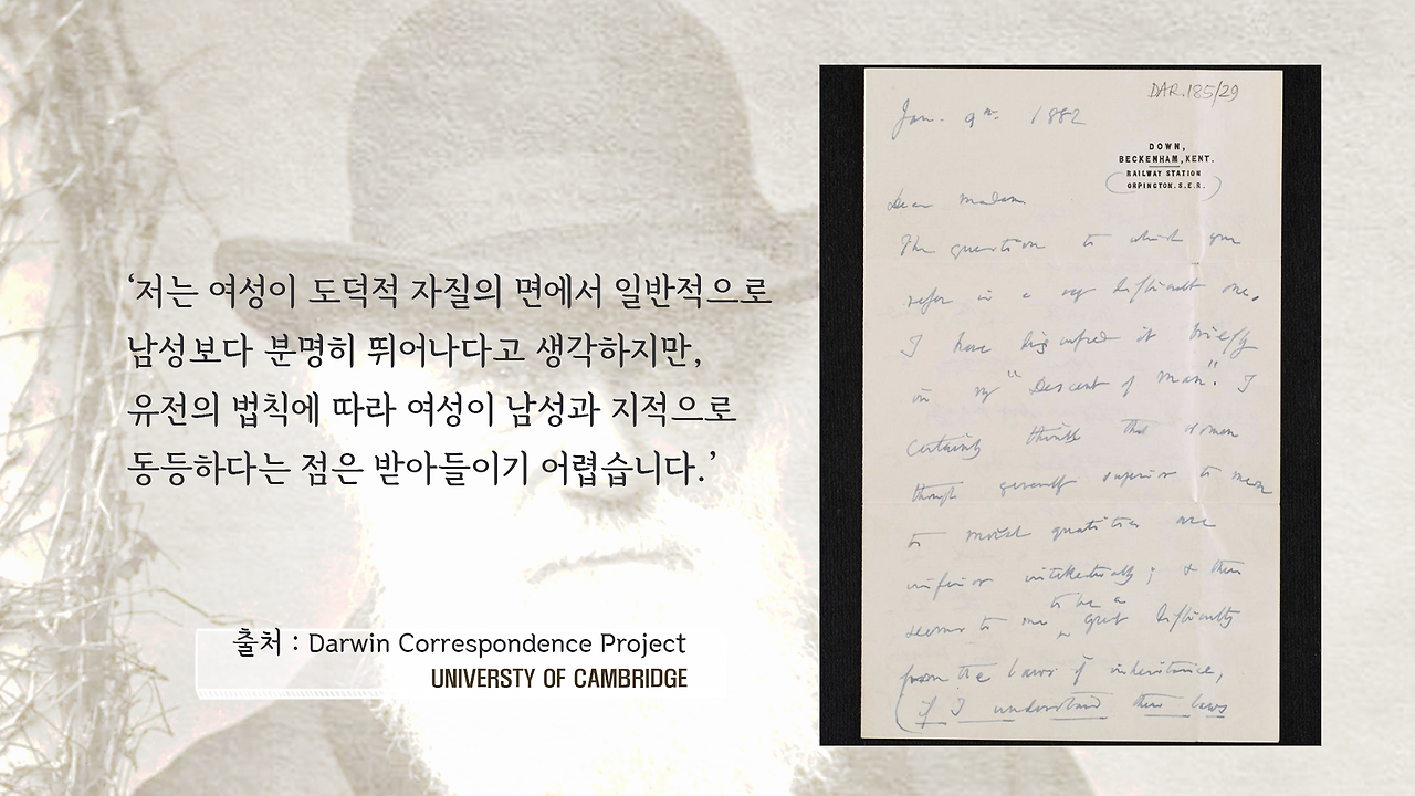 “저는 여성이 도덕적 자질의 면에서 일반적으로 남성보다 분명히 뛰어나다고 생각하지만, 유전의 법칙에 따라 여성이 남성과 지적으로 동등하다는 점은 받아들이기 어렵습니다.”라고요.
