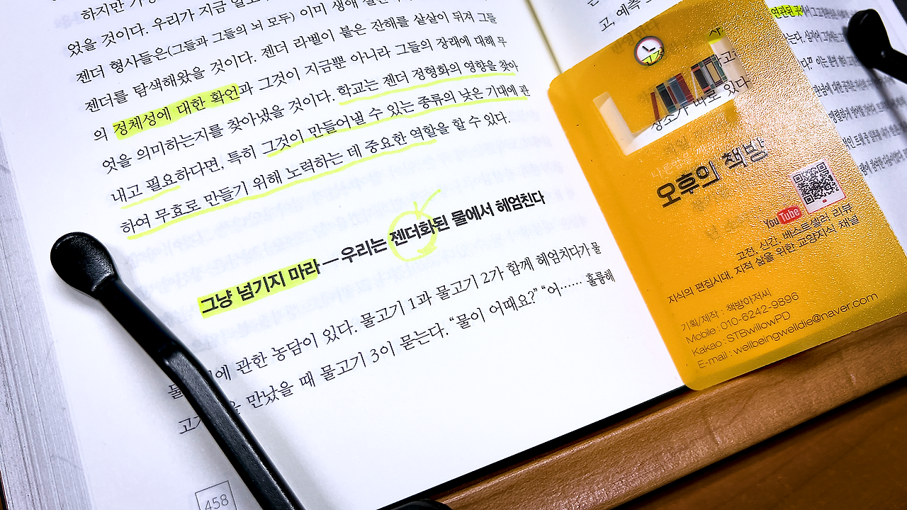 우린 이런 젠더문제를 비롯해서 여러 고정관념을 전혀 의식하지 못한 채 살아갈 수도 있다는 비유예요. 저자는 이런 고정관념들을 당연하게 받아들이지 말자고 부탁해요. 그래서 마지막 챕터의 제목은 “그냥 넘기지 마라 – 우리는 젠더화된 물에서 헤엄친다”입니다.