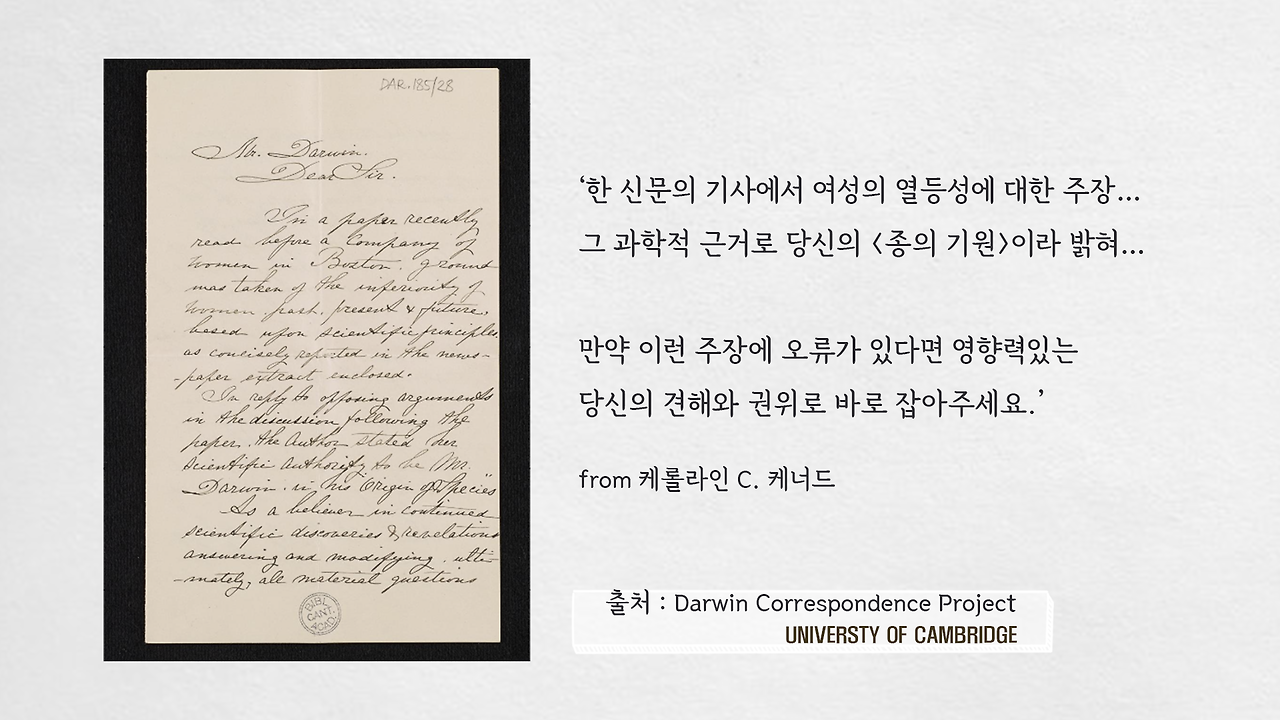 1881년 보스턴 외곽 매사추세츠 브루클라인에 사는 캐럴라인 케너드는 한 여성모임에서 어떤 사람이 다윈의 저서를 근거로 ‘과거와 현재, 미래에 걸쳐 여성이 열등하다는 사실은 과학적 원리에 기초한다.’는 주장을 들었습니다. 설마 다윈이?