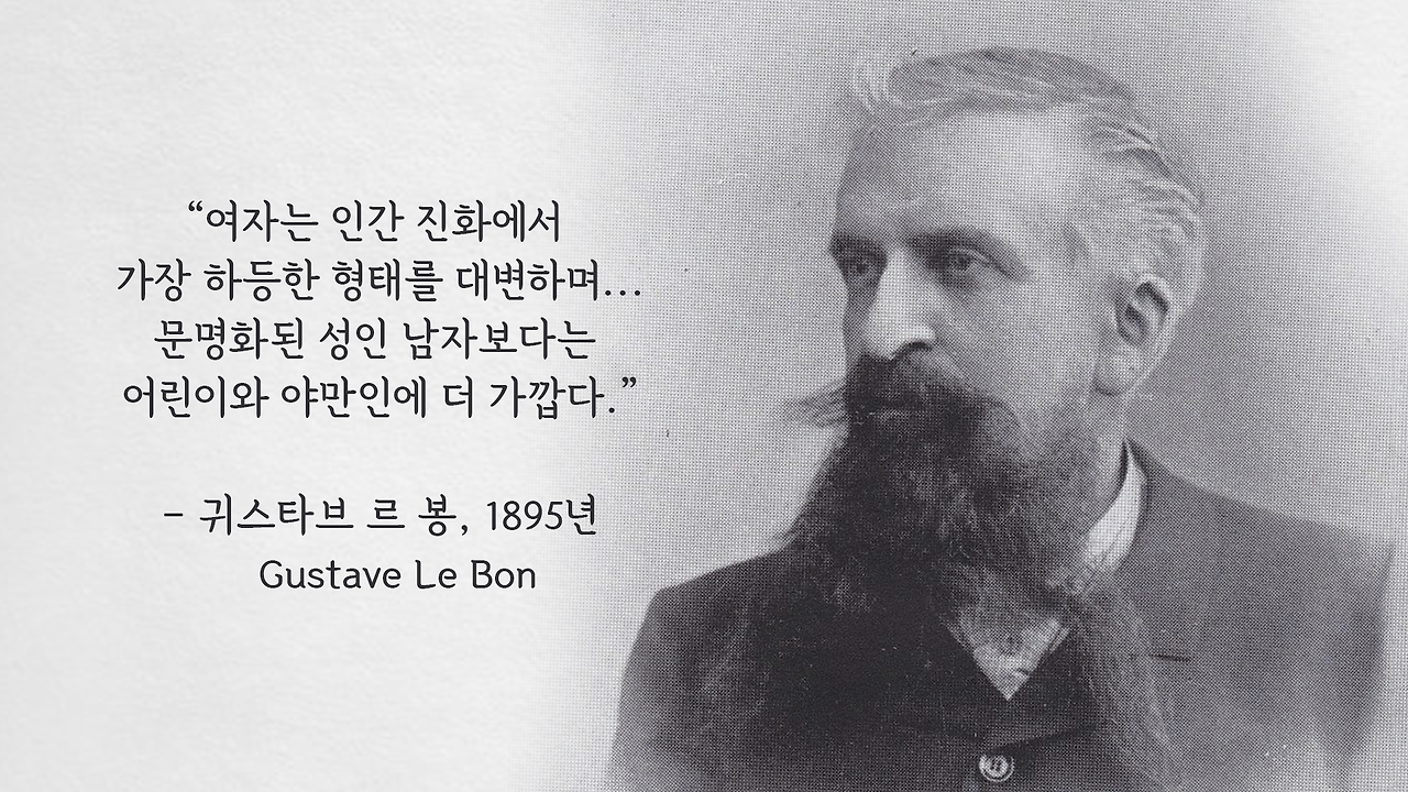 “여자는 인간 진화에서 가장 하등한 형태를 대변하며... 문명화된 성인 남자보다는 어린이와 야만인에 더 가깝다.”- 귀스타브 르봉(1895년)