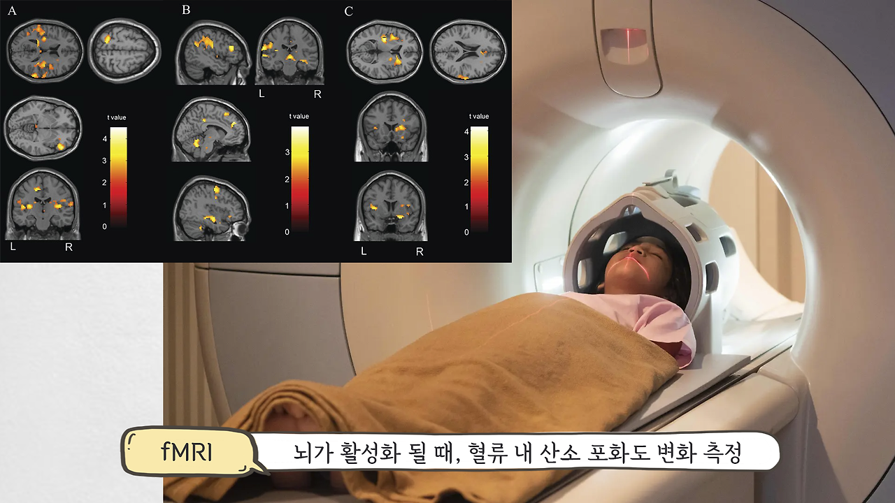 Functional MRI, 줄여서 fMRI라고 부르는 이미지입니다. 뇌에서 어떤 특정 활동을 할 때, 그 부위에 산소의 소비량이 많아질 것이고, 그러기 위해선 혈류량도 늘어날 것이란 개념이에요. 그것을 MRI 위에, 이렇게 컬러풀한 색을 얹어 만든 이미지입니다. 저도 처음 이 이미지를 처음 봤을 때 너무나 아름답고 강력했어요. 이제 살아있는 사람의 뇌 속에서 일어나는 일을 볼 수 있다는 기대가 부풀었어요. 뇌인지과학, 신경심리학에서 특히 fMRI의 활용도가 높은데요. 고려대 심리학과 남기춘 교수님 팀의 연구에 피실험자로 참여한 적이 있는데요. MRI 장비 안에 누워있는 것은 같지만, 그 안에서 단어나 이미지와 같은 특정 과제를 보여줍니다. 이 과정에서 뇌혈류량을 측정하는 것이죠. 그런데 이 데이터를 얻는 것은 단순하지 않습니다. 뇌에서 일어나는 활동은 순간적이지만, 혈류량의 변화는 대개 4~6초의 지연기를 갖고 있고 그 변화가 완만합니다. 때문에 과제마다 간격도 중요하고, 저도 그랬지만, 피실험자가 실험 동안에 과제에만 집중하기에 상당히 힘든 환경입니다. 이런 잡음을 통제하는 것도 필요합니다. 그럼에도 이 아름다운 이미지가 주는 효과가 너무 강력했던 것 때문일까요. 뇌 영상 기술의 혁신은 너무 부풀려지기도 했습니다.