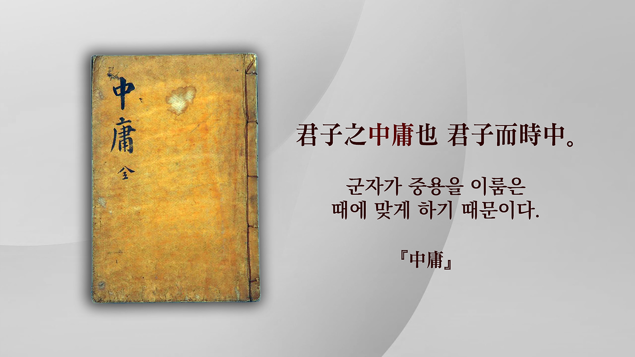공자의 가르침을 한마디로 ‘시중의 도’라고 합니다. 시중時中은 『中庸』 2장의 "군자가 중용을 이룸은 때에 맞게 하기 때문이다."라는 문장에서 나옵니다.