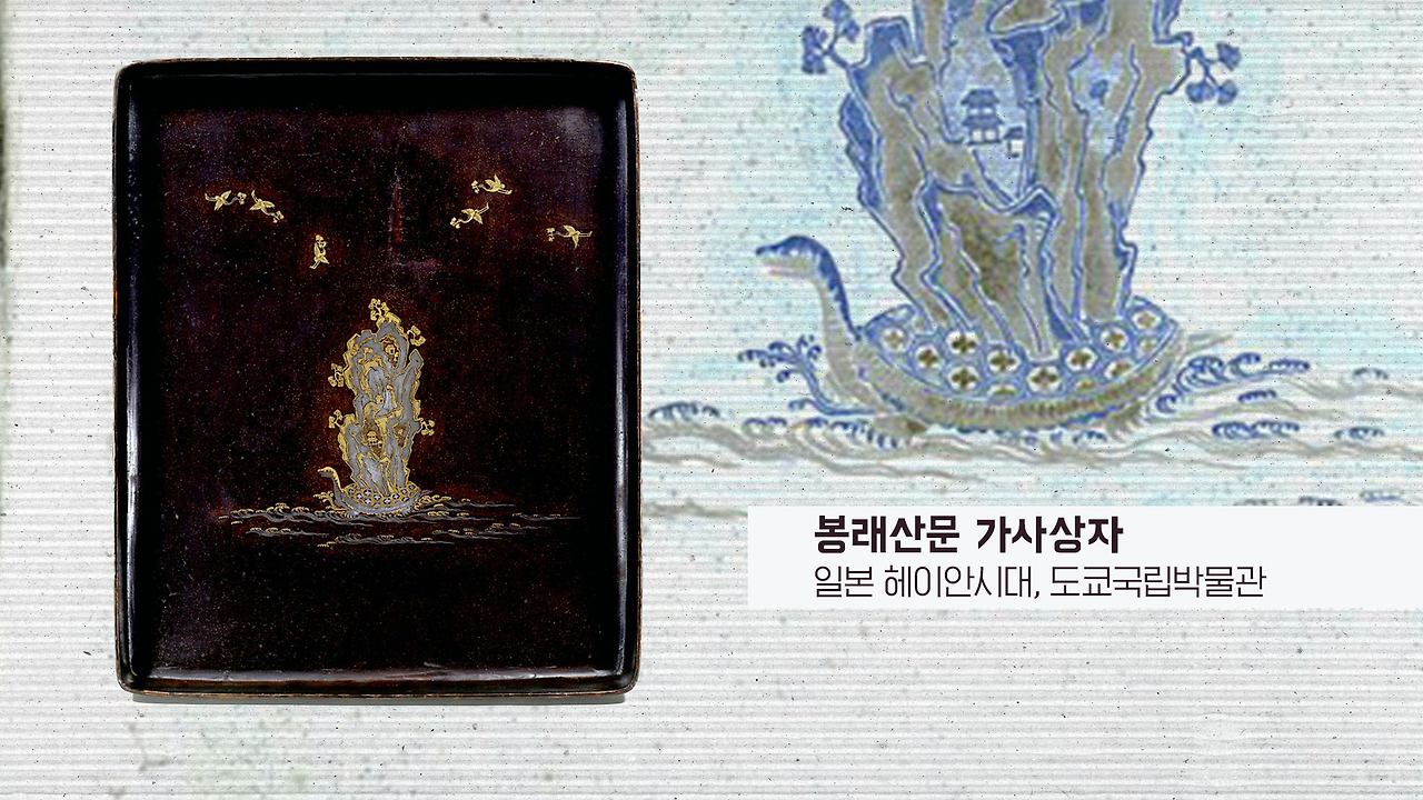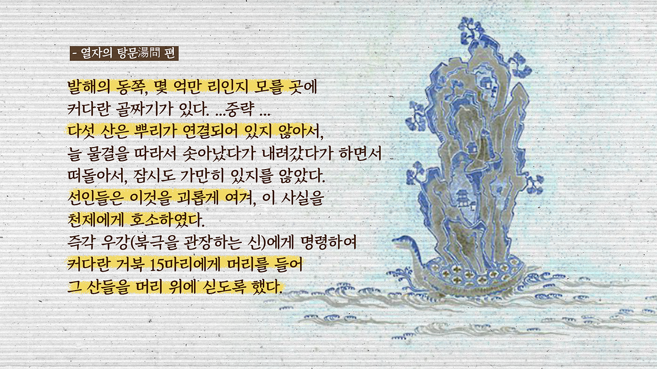 답을 좀 얻은 게, 일본미술에서 일단 시각적인 걸 얻었고요. 도쿄 국립박물관에 스님의 가사를 넣는 함이 있어요. 근데 그 함에 보면 거북이가 있는데요 거북이가 산을 얹고 있습니다. 그리고 우리가 생각해 보면, 통일신라부터 쭉 나오는 비석 받침이 거의 다 거북이죠. 귀부龜趺라고 하는 뭔가 짊어졌어, 왜 그럴까? 제가 그래서 도교경전을 찾아봤어요 근거가 있을 거야. 《열자列子》라는 경전이 있는데요. 거기에 <귀허설화歸墟說話>라고 하는 설화가 있습니다. (발해 동쪽에 삼신산)이 있었는데요. 그 산에 사는 사람들 전부 신선이었다고 합니다. 근데 이 산이 뿌리가 없어 섬이 부표처럼 이렇게 떠다닌 거죠. 그러면 이 신선들이 과연 안전하게 생각했을까? 결국 자기들이 너무 불안하니까 천제天帝, 하늘의 신에게 민원을 넣습니다. 조치 좀 해달라. 어떻게 조치를 했냐면 천제가 15마리의 자라에게 산을 얹게 합니다.