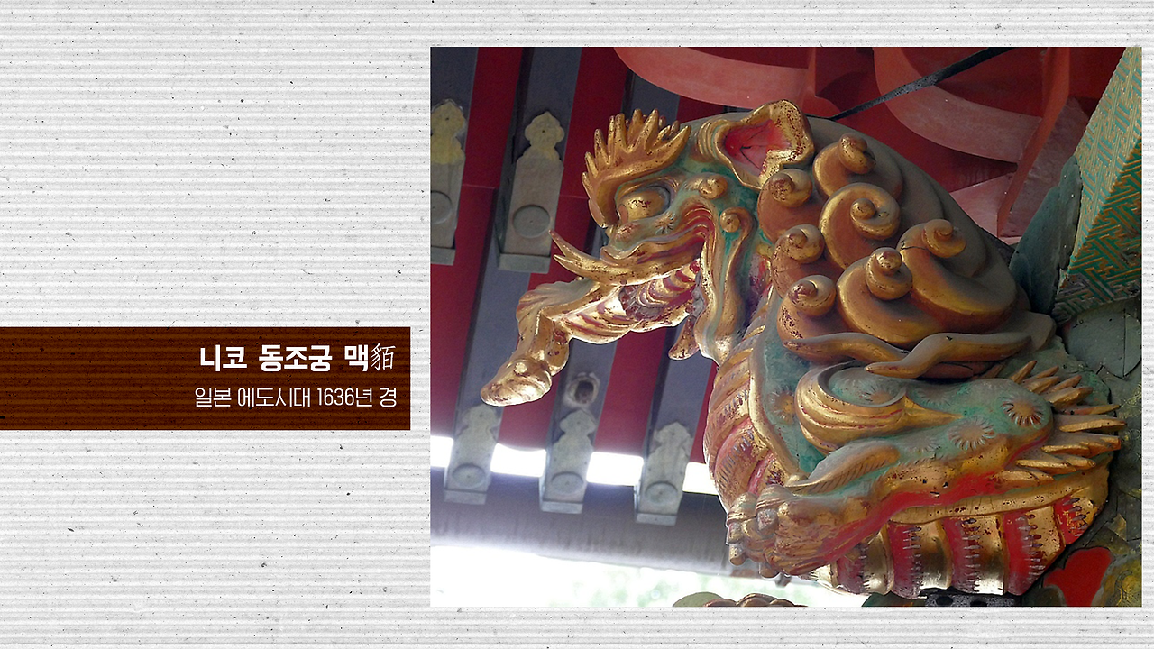 김용덕 작가 : 너무 정확하게 보셨는데요! 왜냐하면 제가 그거를 대표적으로 말씀드리자면 불가사리를 우리는 '불가살(不可殺)'이라 부르지만 그건 엄청 최근에 불려진 명칭이고요. 원래는 맥貊이라고 하는 동물입니다. 아! 맥貊, 들어봤습니다. 실제로 존재하기도 하는 동물이에요. 근데 맥貊이 일본에서 굉장히 유행하거든요. 실제로 뭐 포켓 몬스터라든가, 여러 가지 보면 맥貊을 모티브로 한 몬스터들이 나와요. 근데 이 맥貊이 쇠鐵를 먹잖아요. 임진왜란 때 도요토미 히데요시 정권이 몰락하고, 도쿠가와 이에야스가 집권하면서 '애도시대'라는 평화기가 찾아왔어요. 그때 도쿠가와 이에야스를 기리는 신사가 건립되는데 그 공포栱包 곳곳에 맥貊이 있습니다. 그거는 쇠를 먹는 맥이니 이제 평안한 세상이 왔으니 전쟁에 필요한 금속들을 '다 이 맥貊한테 주겠다'라는 뜻을 지니고 있습니다.