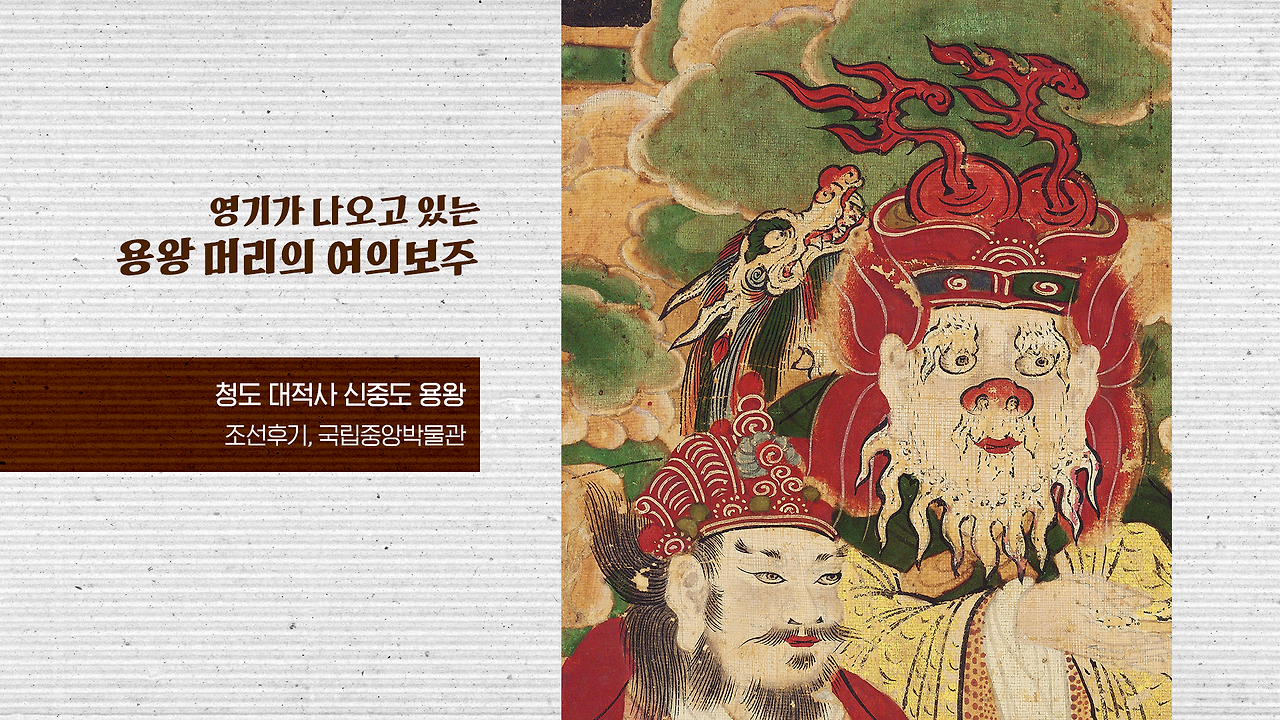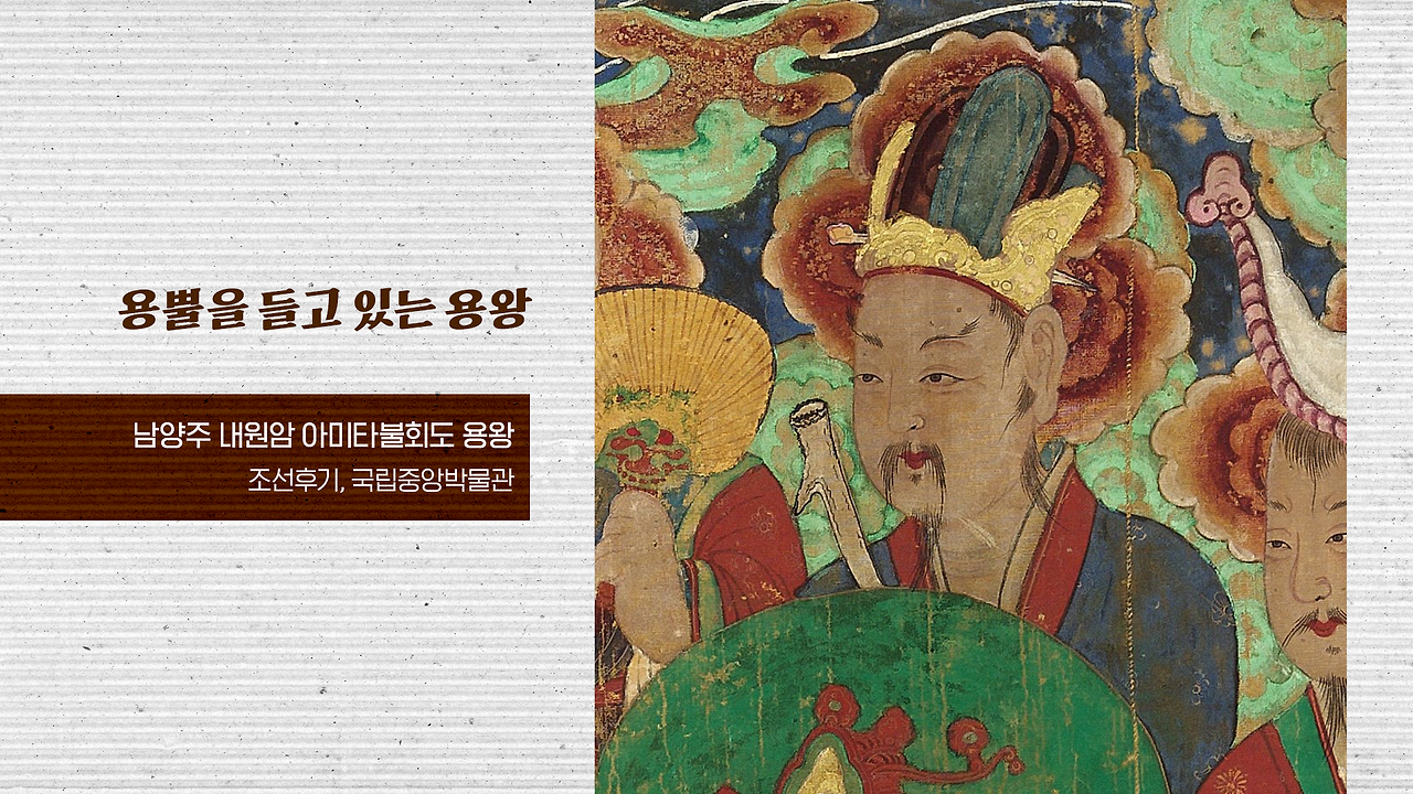 불교회화의 용왕 도상圖像은 한 가지는 얼굴이 용 형태, 용면형龍面形이라고 합니다. 그리고 하나는 할아버지나 노인, 왕의 형태를 제왕형帝王形, 그리고 여러 가지 '지물持物'라고 하는 물건들을 들고 있죠. 대부분 관리를 상징하는 홀笏을 들고 있거나, 아니면 용 뿔을 들고 있기도 합니다. 하지만 여기서 가장 큰 특징은 바로 머리 관을 쓰고 있는데 그 관에 여의주, 보주가 표현이 됩니다. 하나일 수도 있고, 두 개일 수도 있고 여러 개일 수도 있습니다. 이게 제가 여태껏 조사한 바에 의하면 중국과 일본의 불교 미술에는 그런 형태를 찾기가 힘들어요. 여의주도 없고? 거의 다 여의주를 들고 있습니다.