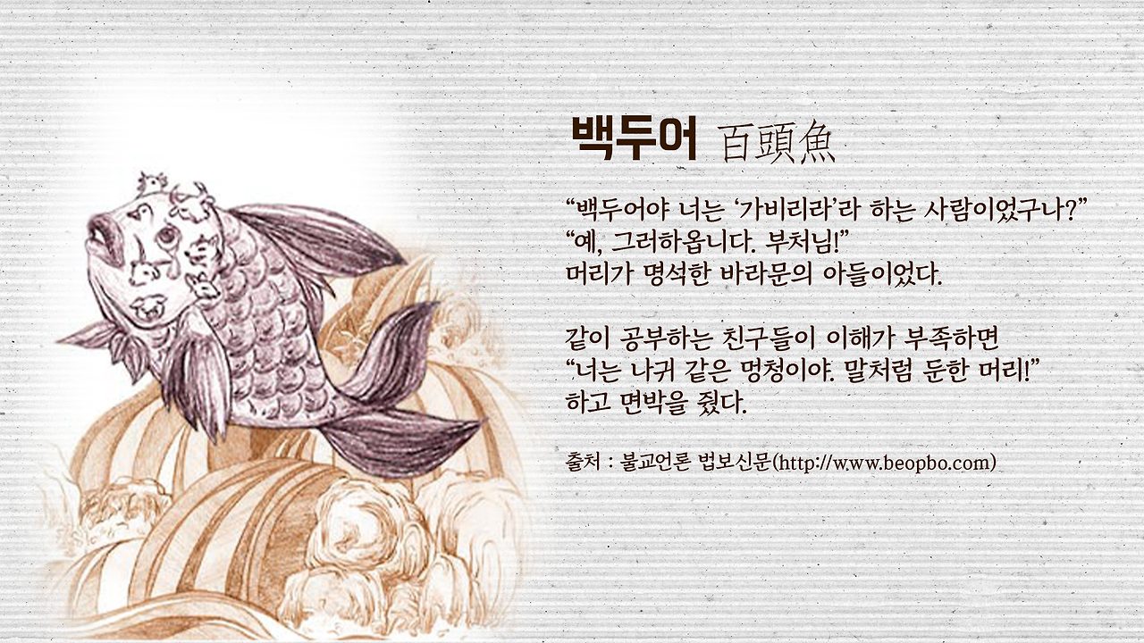 교훈의 대표적인 게 뭐냐고 여러분들이 물어보시면 저는 항상 '백두어百頭魚'라고 하는 물고기를 꼽곤 합니다. 백두어가 말 그대로, 머리가 100개 달렸다는 뜻입니다. 100가지 동물의 머리를 달고 있는 괴물 물고기입니다. 불교 경전에 나오는 설화인데요. 근데 원래 이 백두어가 사람이었어요. 전생에는! 아주 총명하고 똑똑한 사람입니다. 근데 이 사람이 입이 좀 험했습니다. 사실 우리 비속어 쓸 때 동물에 많이 비유하죠? 그래가지고 이 사람이 죽고 난 뒤에 자기가 험담했던 동물들의 머리를 다 달고 태어난 거죠. 백개씩이나? 네, 얼마나 욕을 그렇게 했으면... 그래서 저는 이걸 보고 "아, 말이라는 게 참 무섭구나!"