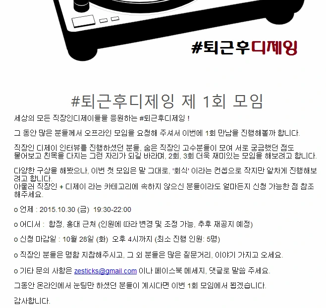 페이스북 #퇴근후디제잉 그룹 인원이 두 자리에서 세 자리로 되면서 모임에 대한 이야기가 나오기 시작했습니다. 클럽을 빌려서 음악을 틀 수 있는 자리를 만들자, 한 번 모여서 작게 티타임이나 가져보자, 아직 모임을 열기는 좀 그렇다... 어떻게 해야 할지 그룹 장으로서 굉장히(?) 고민했었습니다. 언제나 그렇듯 일단 지르고 봐야겠기에, 설문을 돌렸고, 참석 인원을 모왔습니다.
