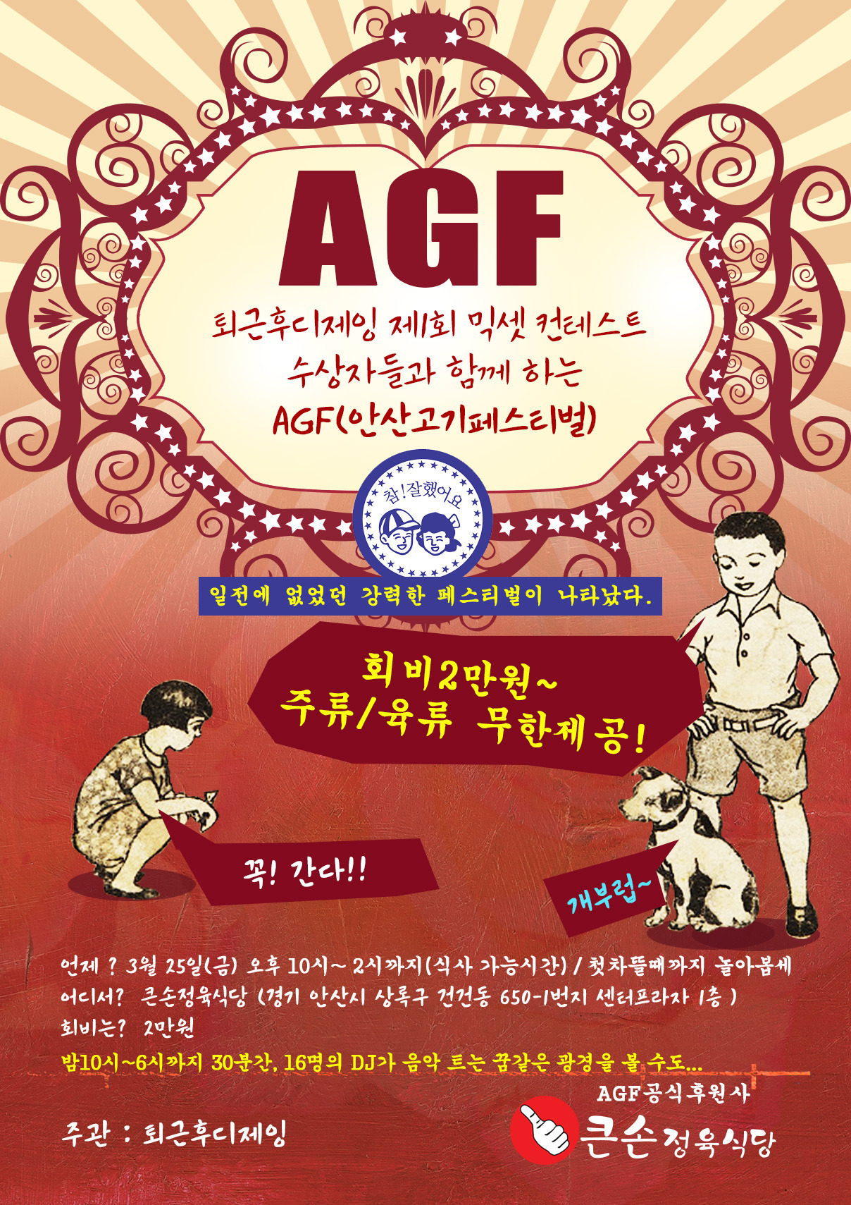 #퇴근후디제잉 은 세상의 모든 직장인 디제이들을 응원하기 위해 다양한 프로젝트를 기획하고 진행하고 있습니다. 이번 2016년 3월에 새롭게 기획해 진행한 AGF(안산 고기 페스티벌)에 대한 후기를 전하고자 합니다.