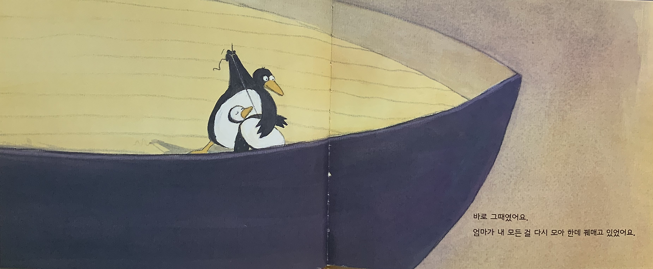 엄마들에게 이 그림책을 보여주면 ‘헉’ 소리가 나도록 놀란다. 흩어진 아이의 조각을 찾아 꿰매고 있는 엄마 펭귄을 보며 결국 눈물을 뚝뚝 흘리는 엄마도 있고 목에 메여 말이 잘 안 나온다는 엄마도 있다. 나 역시 그랬다. 엄마의 감정도, 아이의 감정도 몇 장 안 되는 그림과 글로 이렇게 자신을 돌아보게 만들고, 다독여주고, 관계를 치유해 주는 그림책이 있다니 감탄이 절로 나온다.