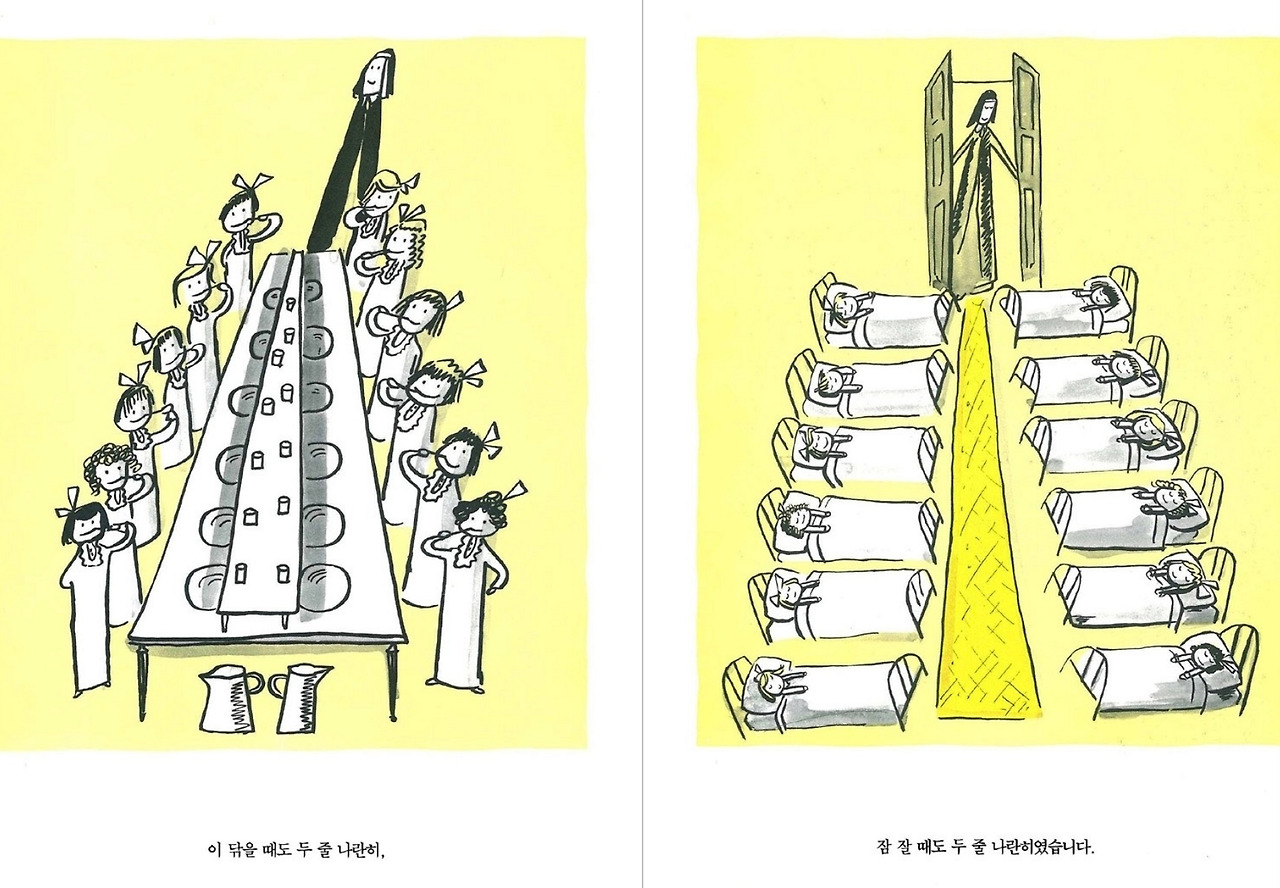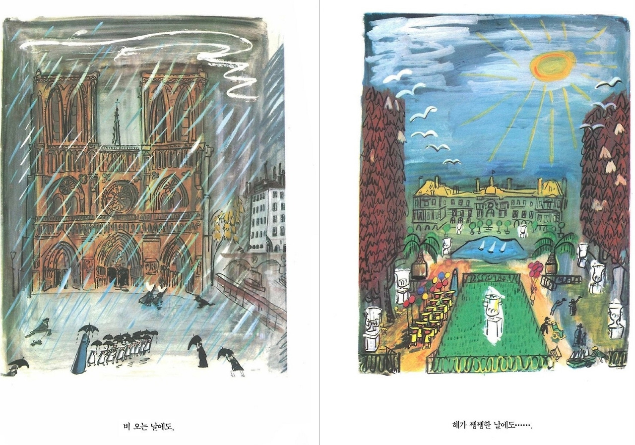 표현주의 기법은 인물이나 사물을 과장되거나 왜곡해서 작가의 느낌과 생각을 전달하는 방식이라고 한다. 지금이야 너무 흔하다 못해 거의 대부분의 그림책이 그렇게 표현하고 있는 것 같지만 옛날에는 아니었나 보다. 루드비히 베멀먼즈가 거의 최초로 그렇게 표현했다고 하니 말이다. 오랜만에 마들린느 시리즈나 다시 찾아볼까?